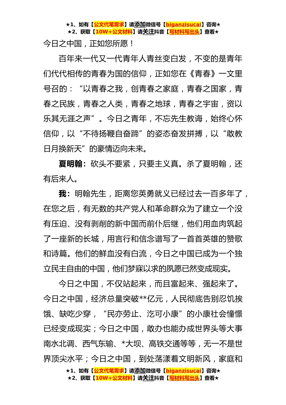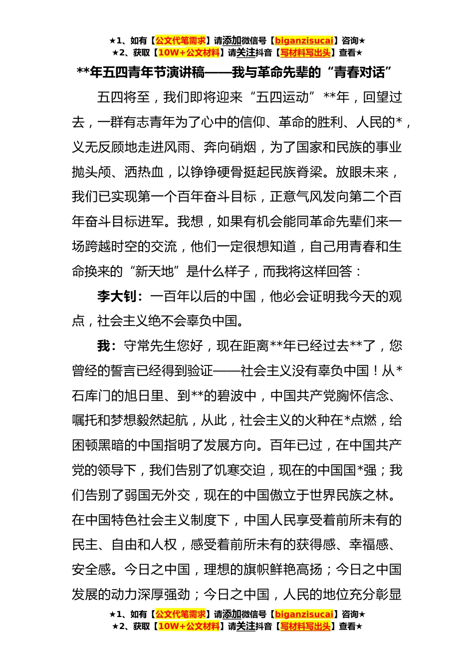 ★1、如有【公文代笔需求】请添加微信号【biganzisucai】咨询★★2、获取【10W+公文材料】请关注抖音【写材料写出头】查看★**年五四青年节演讲稿——我与革命先辈的“青春对话”五四将至,我们即将迎来“五四运动”**年,回望过去,一群有志青年为了心中的信仰、革命的胜利、人民的*,义无反顾地走进风雨、奔向硝烟,为了国家和民族的事业抛头颅、洒热血,以铮铮硬骨挺起民族脊梁。放眼未来,我们已实现第一个百年奋斗目标,正意气风发向第二个百年奋斗目标进军。我想,如果有机会能同革命先辈们来一场跨越时空的交流,他们一定很想知道,自己用青春和生命换来的“新天地”是什么样子,而我将这样回答:李大钊:一百年以后的中国,他必会证明我今天的观点,社会主义绝不会辜负中国。我:守常先生您好,现在距离**...