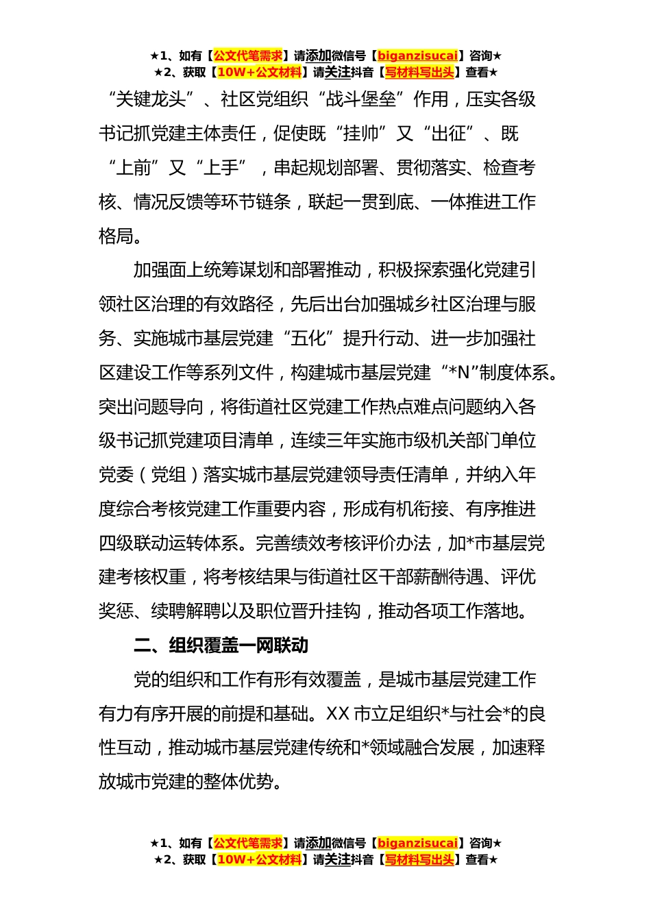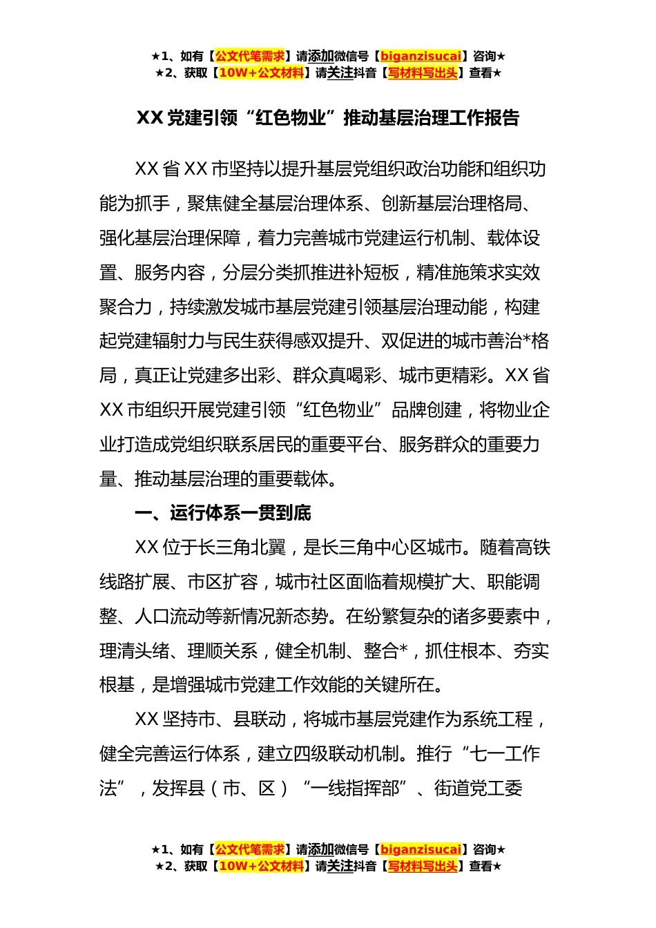 ★1、如有【公文代笔需求】请添加微信号【biganzisucai】咨询★★2、获取【10W+公文材料】请关注抖音【写材料写出头】查看★XX党建引领“红色物业”推动基层治理工作报告XX省XX市坚持以提升基层党组织政治功能和组织功能为抓手,聚焦健全基层治理体系、创新基层治理格局、强化基层治理保障,着力完善城市党建运行机制、载体设置、服务内容,分层分类抓推进补短板,精准施策求实效聚合力,持续激发城市基层党建引领基层治理动能,构建起党建辐射力与民生获得感双提升、双促进的城市善治*格局,真正让党建多出彩、群众真喝彩、城市更精彩。XX省XX市组织开展党建引领“红色物业”品牌创建,将物业企业打造成党组织联系居民的重要平台、服务群众的重要力量、推动基层治理的重要载体。一、运行体系一贯到底XX位于长三角...