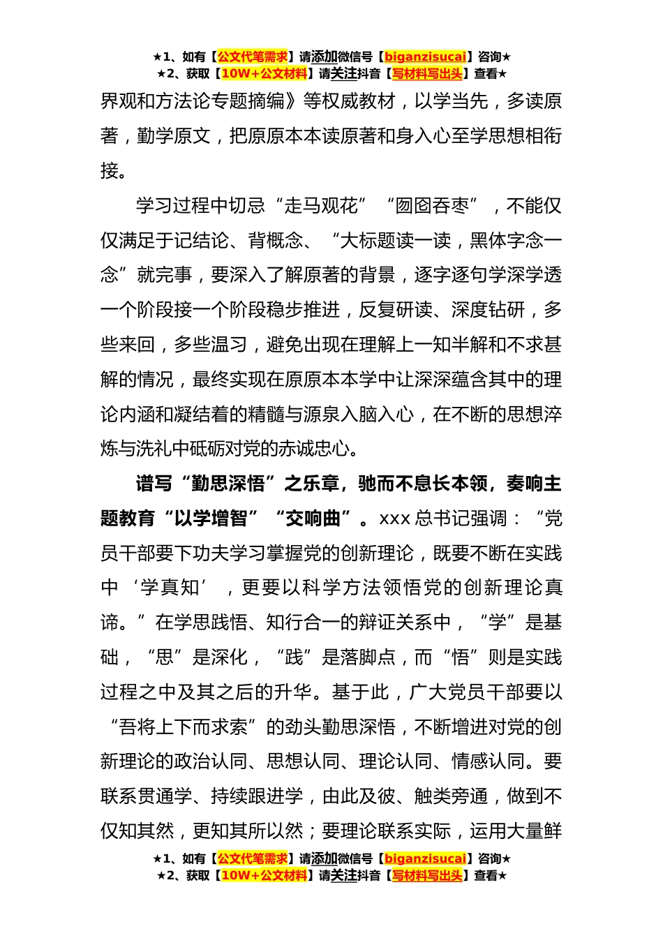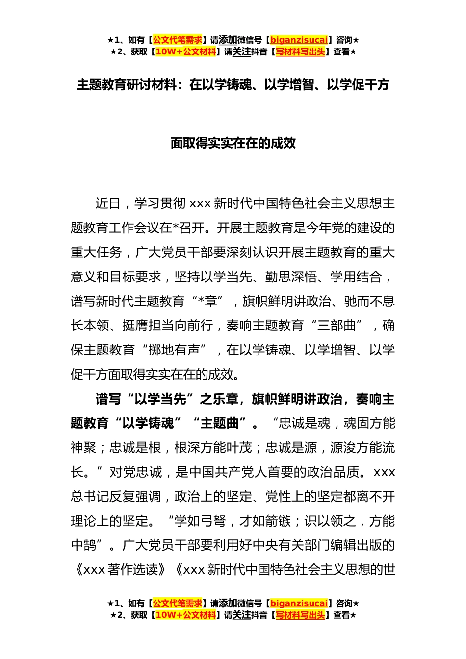 ★1、如有【公文代笔需求】请添加微信号【biganzisucai】咨询★★2、获取【10W+公文材料】请关注抖音【写材料写出头】查看★主题教育研讨材料:在以学铸魂、以学增智、以学促干方面取得实实在在的成效近日,学习贯彻xxx新时代中国特色社会主义思想主题教育工作会议在*召开。开展主题教育是今年党的建设的重大任务,广大党员干部要深刻认识开展主题教育的重大意义和目标要求,坚持以学当先、勤思深悟、学用结合,谱写新时代主题教育“*章”,旗帜鲜明讲政治、驰而不息长本领、挺膺担当向前行,奏响主题教育“三部曲”,确保主题教育“掷地有声”,在以学铸魂、以学增智、以学促干方面取得实实在在的成效。谱写“以学当先”之乐章,旗帜鲜明讲政治,奏响主题教育“以学铸魂”“主题曲”。“忠诚是魂,魂固方能神聚;...