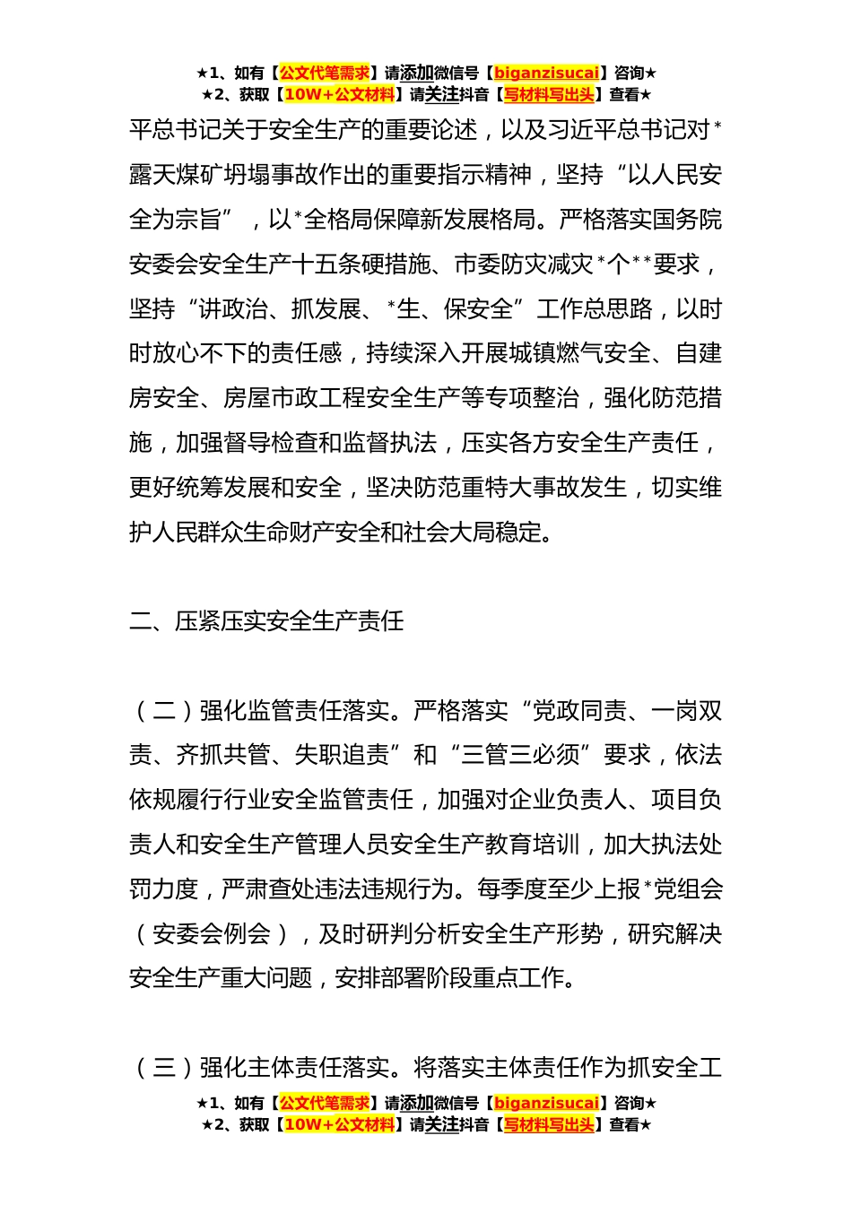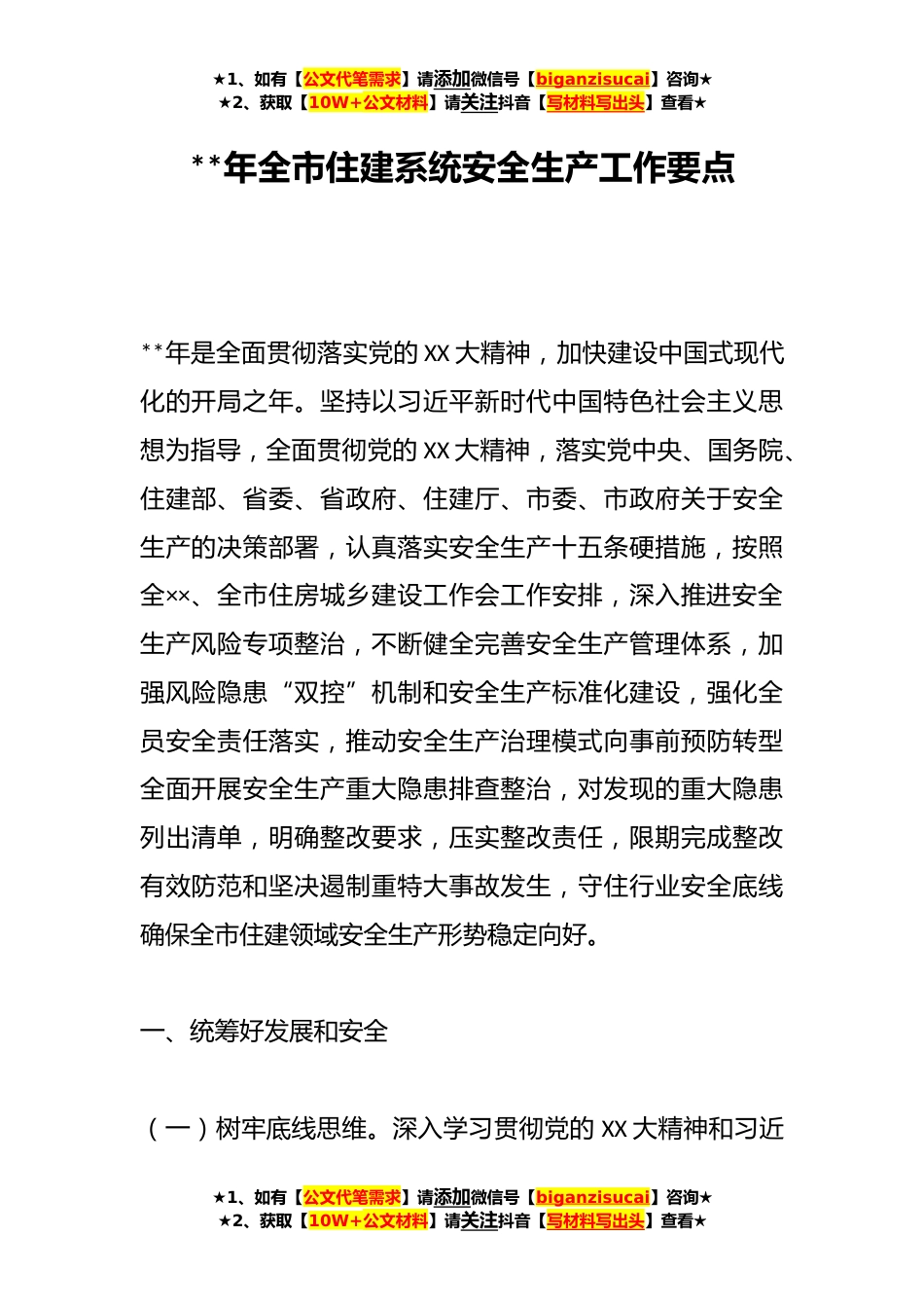 ★1、如有【公文代笔需求】请添加微信号【biganzisucai】咨询★★2、获取【10W+公文材料】请关注抖音【写材料写出头】查看★**年全市住建系统安全生产工作要点**年是全面贯彻落实党的XX大精神,加快建设中国式现代化的开局之年。坚持以习近平新时代中国特色社会主义思想为指导,全面贯彻党的XX大精神,落实党中央、国务院、住建部、省委、省政府、住建厅、市委、市政府关于安全生产的决策部署,认真落实安全生产十五条硬措施,按照全××、全市住房城乡建设工作会工作安排,深入推进安全生产风险专项整治,不断健全完善安全生产管理体系,加强风险隐患“双控”机制和安全生产标准化建设,强化全员安全责任落实,推动安全生产治理模式向事前预防转型全面开展安全生产重大隐患排查整治,对发现的重大隐患列出清单,...