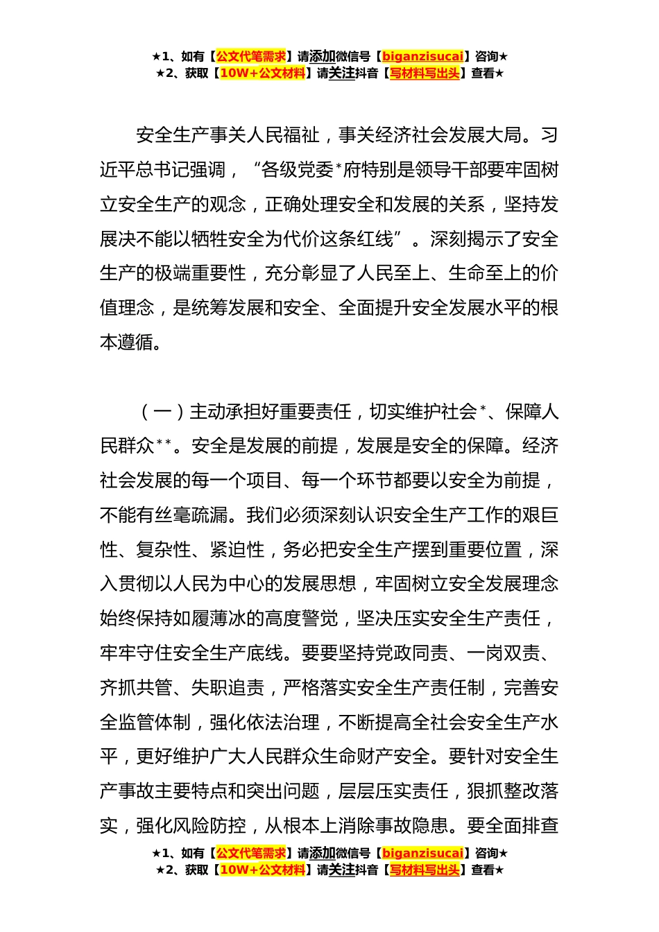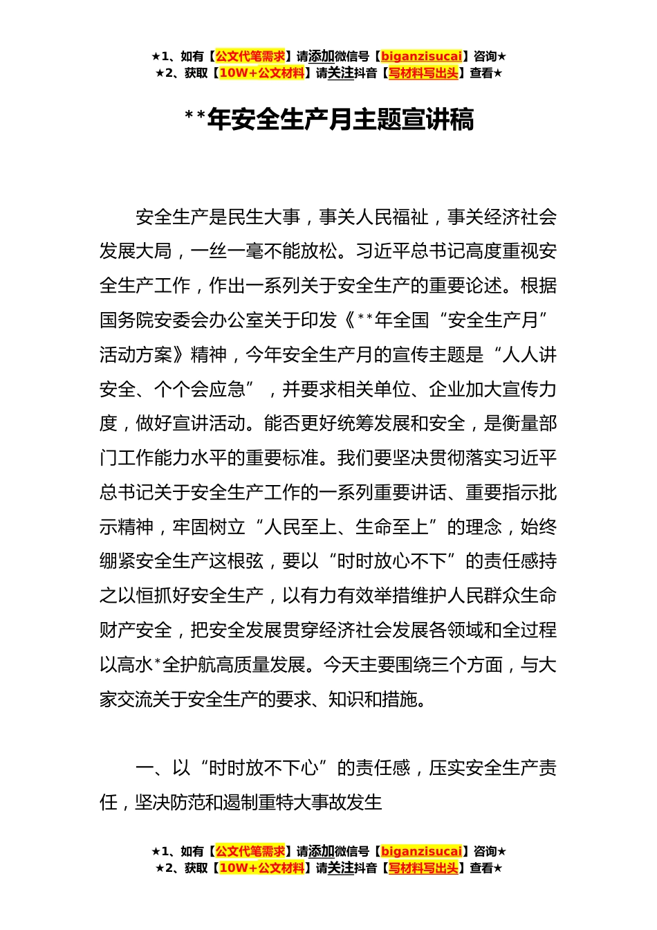 ★1、如有【公文代笔需求】请添加微信号【biganzisucai】咨询★★2、获取【10W+公文材料】请关注抖音【写材料写出头】查看★**年安全生产月主题宣讲稿安全生产是民生大事,事关人民福祉,事关经济社会发展大局,一丝一毫不能放松。习近平总书记高度重视安全生产工作,作出一系列关于安全生产的重要论述。根据国务院安委会办公室关于印发《**年全国“安全生产月”活动方案》精神,今年安全生产月的宣传主题是“人人讲安全、个个会应急”,并要求相关单位、企业加大宣传力度,做好宣讲活动。能否更好统筹发展和安全,是衡量部门工作能力水平的重要标准。我们要坚决贯彻落实习近平总书记关于安全生产工作的一系列重要讲话、重要指示批示精神,牢固树立“人民至上、生命至上”的理念,始终绷紧安全生产这根弦,要以“...