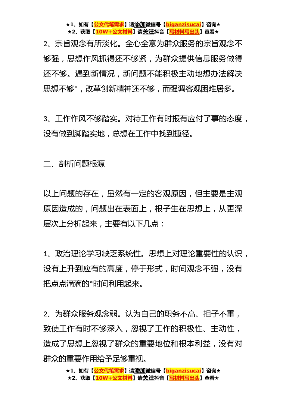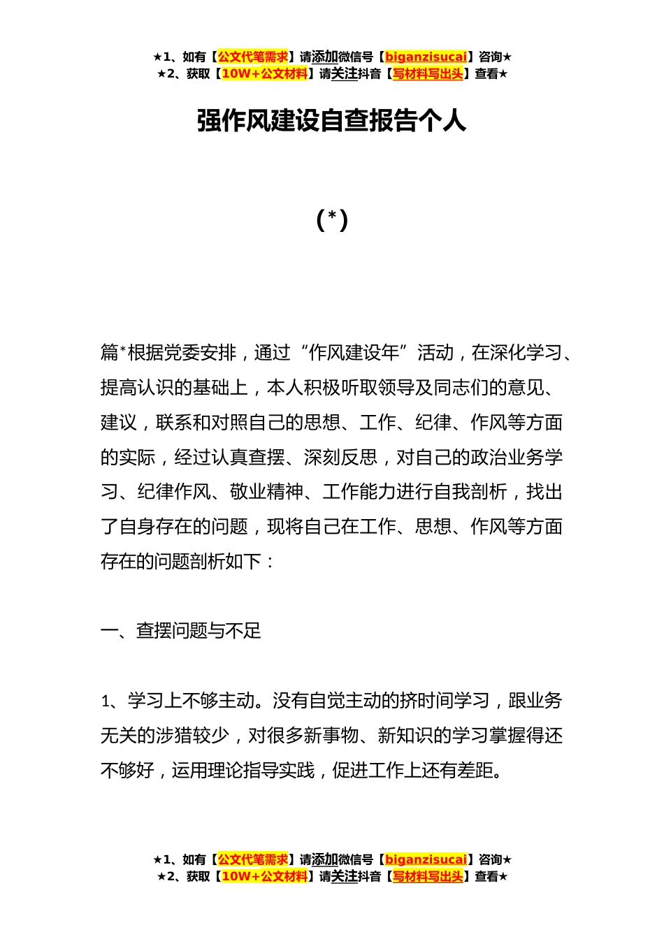 ★1、如有【公文代笔需求】请添加微信号【biganzisucai】咨询★★2、获取【10W+公文材料】请关注抖音【写材料写出头】查看★强作风建设自查报告个人(*)篇*根据党委安排,通过“作风建设年”活动,在深化学习、提高认识的基础上,本人积极听取领导及同志们的意见、建议,联系和对照自己的思想、工作、纪律、作风等方面的实际,经过认真查摆、深刻反思,对自己的政治业务学习、纪律作风、敬业精神、工作能力进行自我剖析,找出了自身存在的问题,现将自己在工作、思想、作风等方面存在的问题剖析如下:一、查摆问题与不足1、学习上不够主动。没有自觉主动的挤时间学习,跟业务无关的涉猎较少,对很多新事物、新知识的学习掌握得还不够好,运用理论指导实践,促进工作上还有差距。★1、如有【公文代笔需求】请添加...