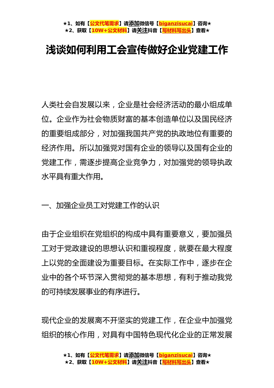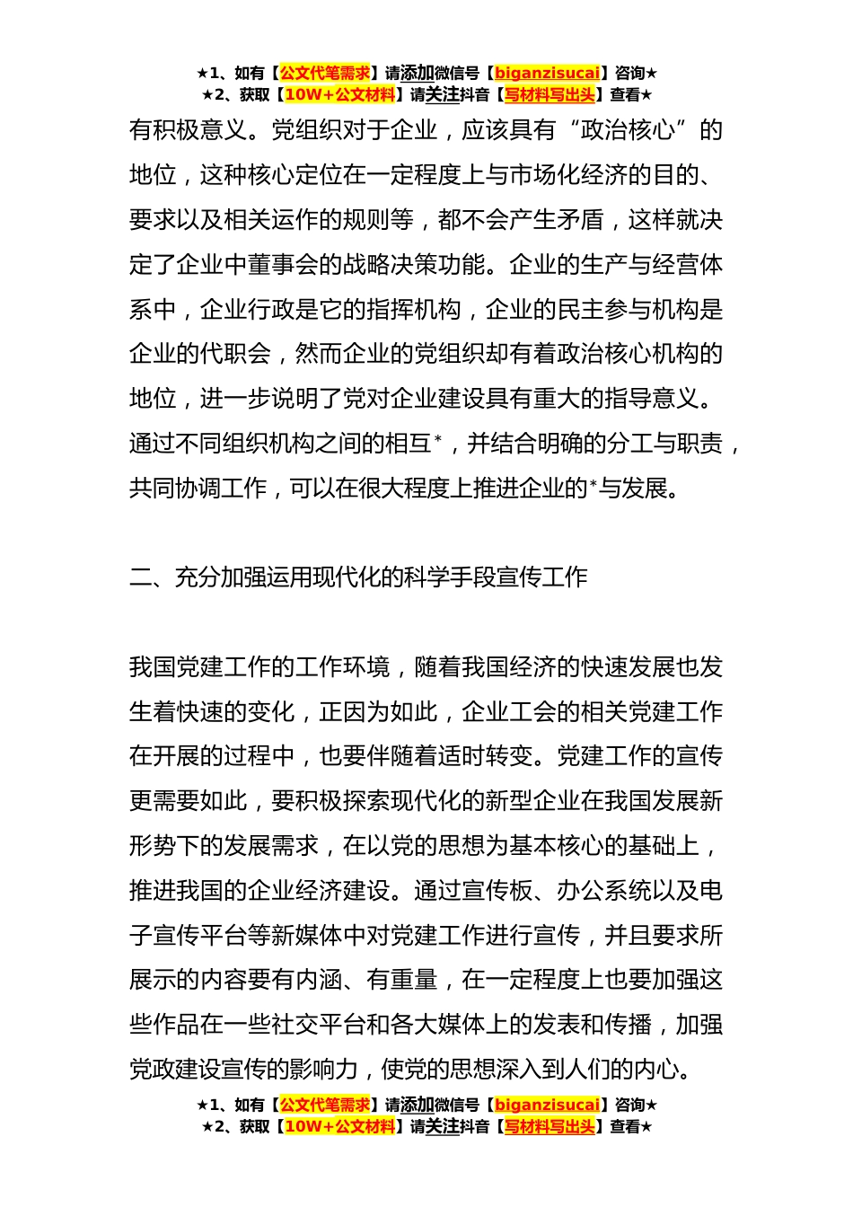 ★1、如有【公文代笔需求】请添加微信号【biganzisucai】咨询★★2、获取【10W+公文材料】请关注抖音【写材料写出头】查看★浅谈如何利用工会宣传做好企业党建工作人类社会自发展以来,企业是社会经济活动的最小组成单位。企业作为社会物质财富的基本创造单位以及国民经济的重要组成部分,对加强我国共产党的执政地位有重要的经济作用。所以加强党对国有企业的领导以及国有企业的党建工作,需逐步提高企业竞争力,对加强党的领导执政水平具有重大作用。一、加强企业员工对党建工作的认识由于企业组织在党组织的构成中具有重要意义,要加强员工对于党政建设的思想认识和重视程度,就要在最大程度上以党的全面建设为重要目标。在实际工作中,逐步在企业中的各个环节深入贯彻党的基本思想,有利于推动我党的可持续发...
