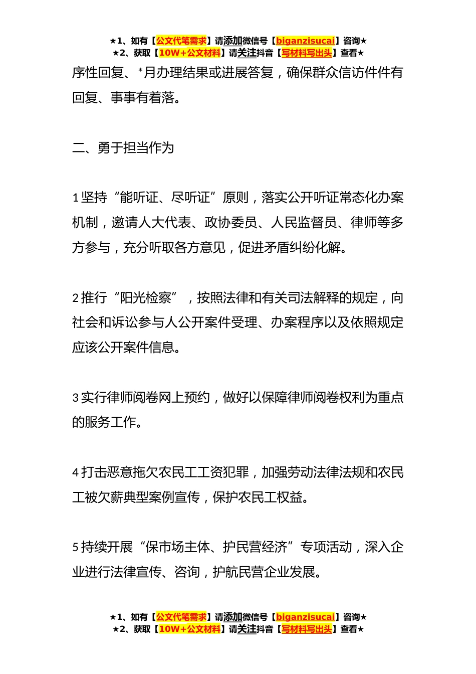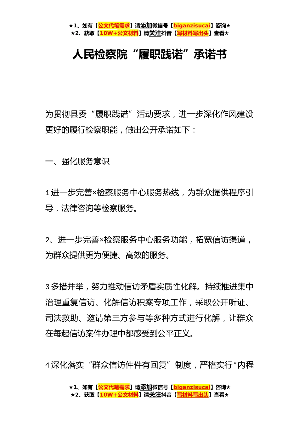 ★1、如有【公文代笔需求】请添加微信号【biganzisucai】咨询★★2、获取【10W+公文材料】请关注抖音【写材料写出头】查看★人民检察院“履职践诺”承诺书为贯彻县委“履职践诺”活动要求,进一步深化作风建设更好的履行检察职能,做出公开承诺如下:一、强化服务意识1进一步完善×检察服务中心服务热线,为群众提供程序引导,法律咨询等检察服务。2、进一步完善×检察服务中心服务功能,拓宽信访渠道,为群众提供更为便捷、高效的服务。3多措并举,努力推动信访矛盾实质性化解。持续推进集中治理重复信访、化解信访积案专项工作,采取公开听证、司法救助、邀请第三方参与等多种方式进行化解,让群众在每起信访案件办理中都感受到公平正义。4深化落实“群众信访件件有回复”制度,严格实行*内程★1、如有【公文代...
