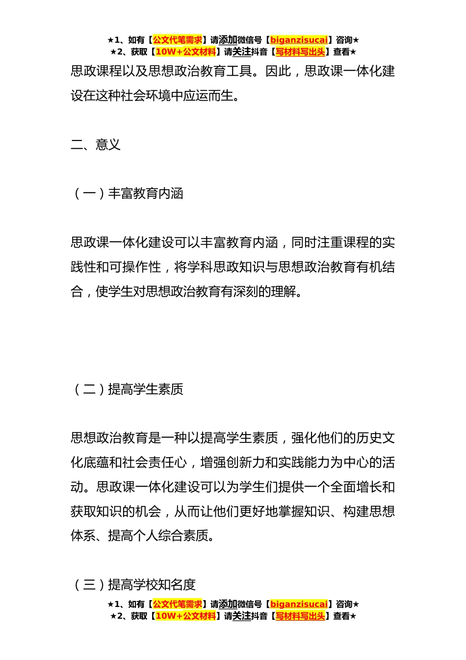 ★1、如有【公文代笔需求】请添加微信号【biganzisucai】咨询★★2、获取【10W+公文材料】请关注抖音【写材料写出头】查看★关于思政课一体化就建设的分析建议思政课一体化建设是指在各级教育机构中将各学科的思政内容进行有机整合,实现思政教育全覆盖、全时段、全过程、全方位。这种方式是为了使学生在学习过程中体验到思政教育对人生发展的重要性与价值,增强他们的思想道德素质,培养他们的创新能力和实践能力,促进他们对社会、文化和人类命运的认知。一、背景作为一种具有深刻意义的教育行为,思想政治教育在现代社会中扮演着越来越重要的角色。随着全球化进程和文化传统的重要性日渐显著,思想政治教育的一体化建设就有了更高的应用价值。在今天的社会经济与文化交流中,学习的质量不仅取决于知识的传递和...