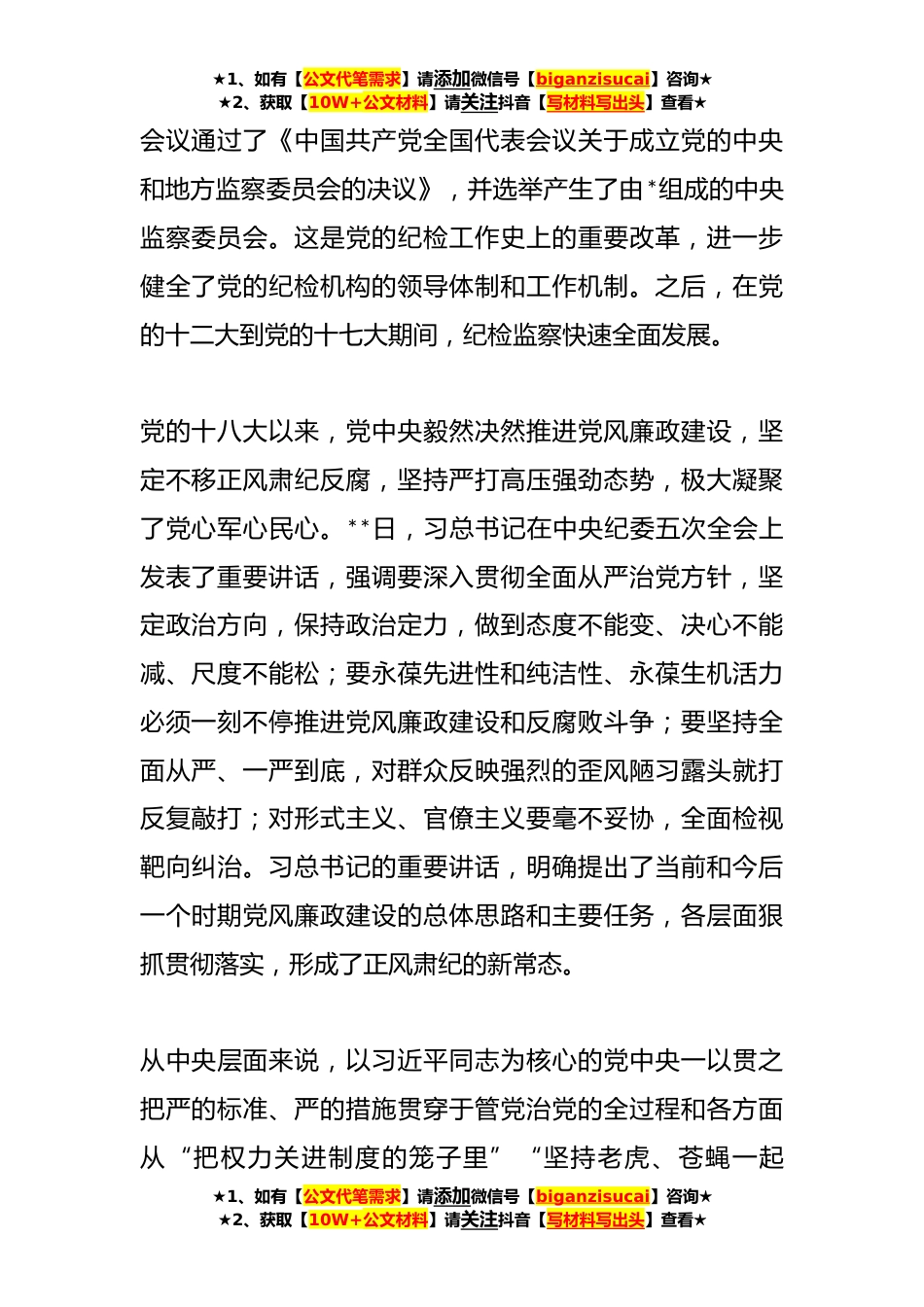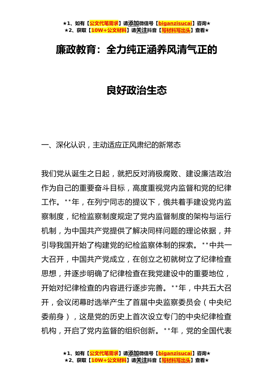 ★1、如有【公文代笔需求】请添加微信号【biganzisucai】咨询★★2、获取【10W+公文材料】请关注抖音【写材料写出头】查看★廉政教育:全力纯正涵养风清气正的良好政治生态一、深化认识,主动适应正风肃纪的新常态我们党从诞生之日起,就把反对消极腐败、建设廉洁政治作为自己的重要奋斗目标,高度重视党内监督和党的纪律工作。**年,在列宁同志的提议下,俄共着手建设党内监察制度,纪检监察制度规定了党内监督制度的架构与运行机制,为中国共产党提供了解决同样问题的理论依据,并引导我国开始了构建党的纪检监察体制的探索。**中共一大召开,中国共产党成立,在创立之初就树立了纪律检查思想,并逐步明确了纪律检查在我党建设中的重要地位,开始对纪律检查的内容进行逐步完善。**年,中共五大召开,会议闭幕时...