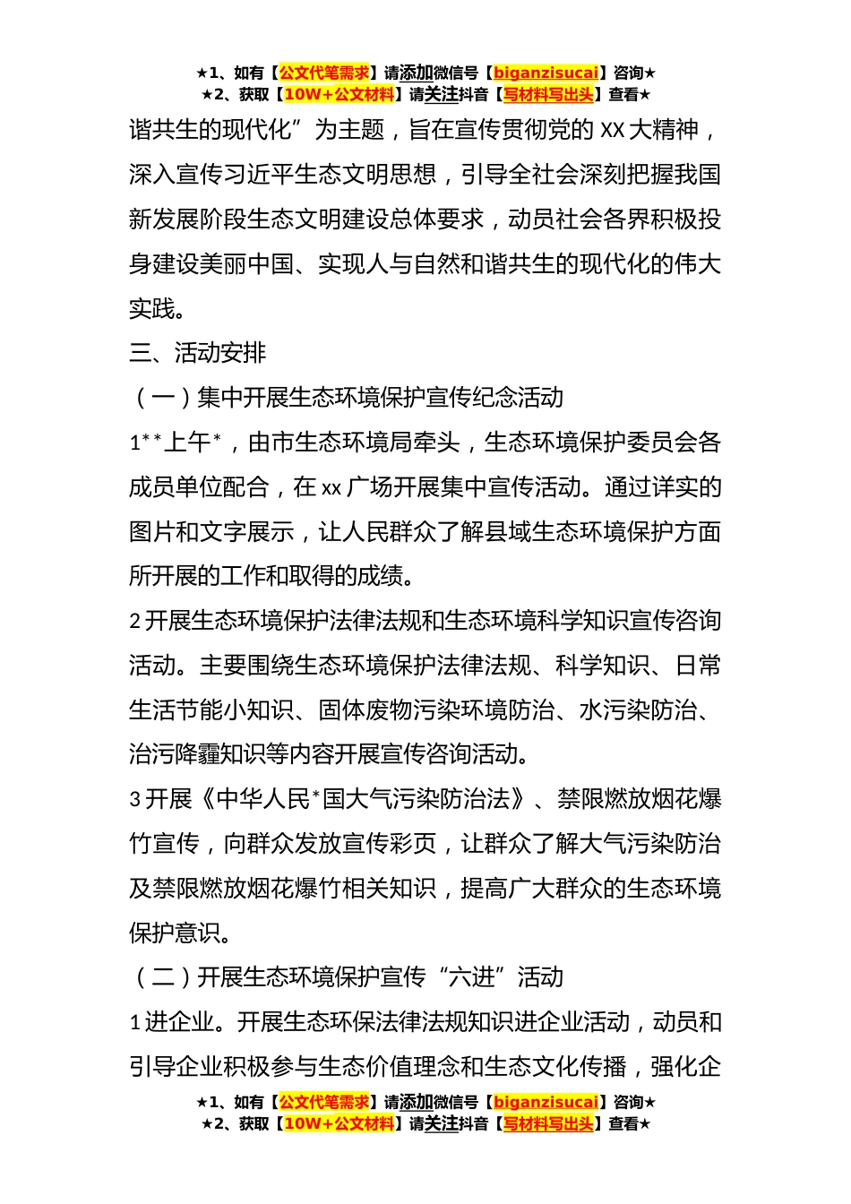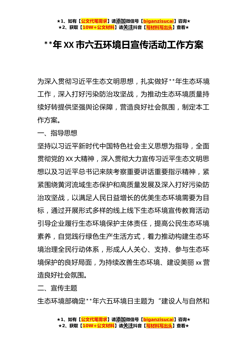 ★1、如有【公文代笔需求】请添加微信号【biganzisucai】咨询★★2、获取【10W+公文材料】请关注抖音【写材料写出头】查看★**年XX市六五环境日宣传活动工作方案为深入贯彻习近平生态文明思想,扎实做好**年生态环境工作,深入打好污染防治攻坚战,为推动生态环境质量持续好转提供坚强舆论保障,营造良好社会氛围,制定本工作方案。一、指导思想坚持以习近平新时代中国特色社会主义思想为指导,全面贯彻党的XX大精神,深入贯彻大力宣传习近平生态文明思想以及习近平总书记来陕考察重要讲话重要指示精神,紧紧围绕黄河流域生态保护和高质量发展及深入打好污染防治攻坚战,以满足人民日益增长的优美生态环境需要为目标,通过开展形式多样的线上线下生态环境宣传教育活动引导企业履行生态环境保护主体责任,提高公民...