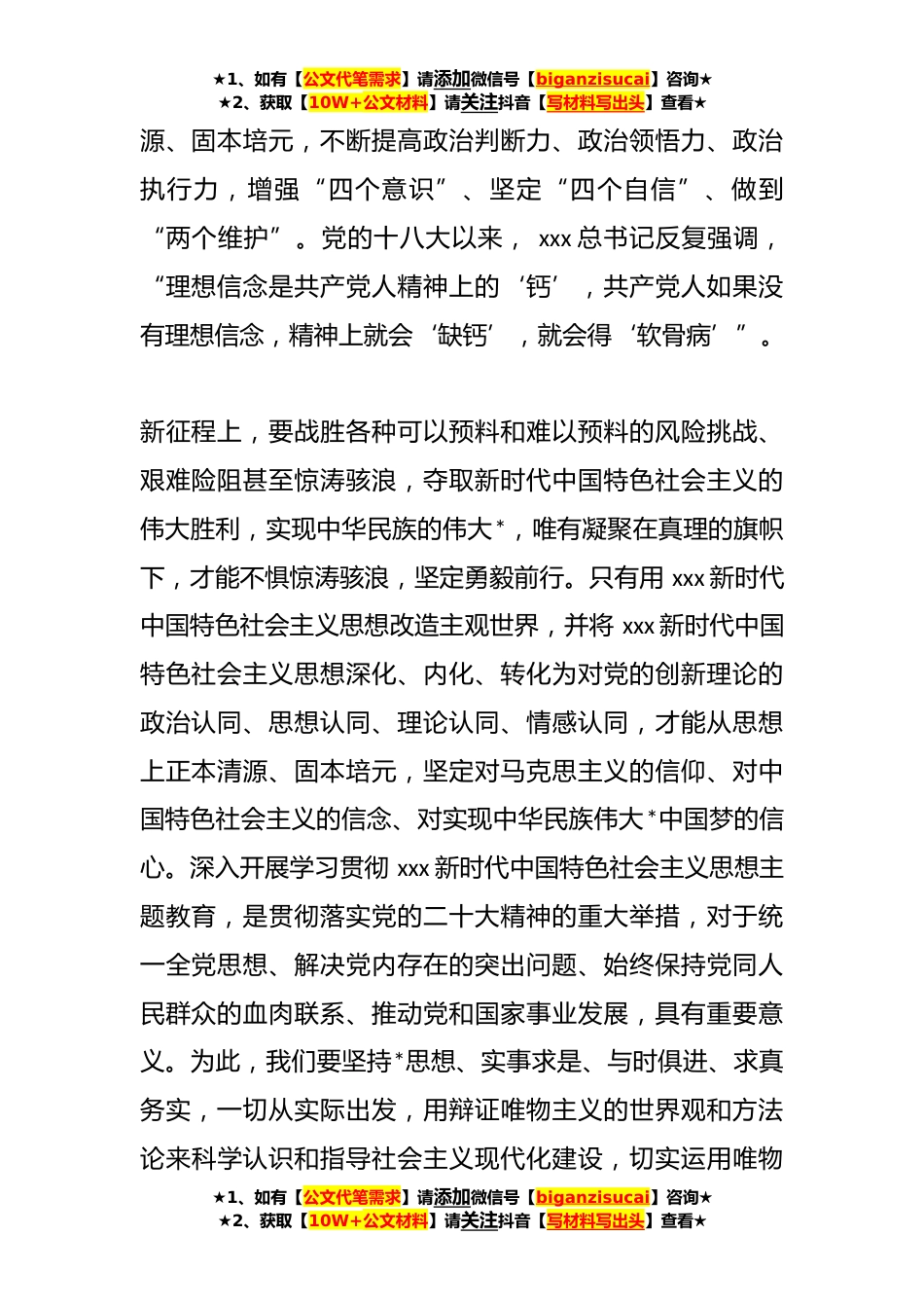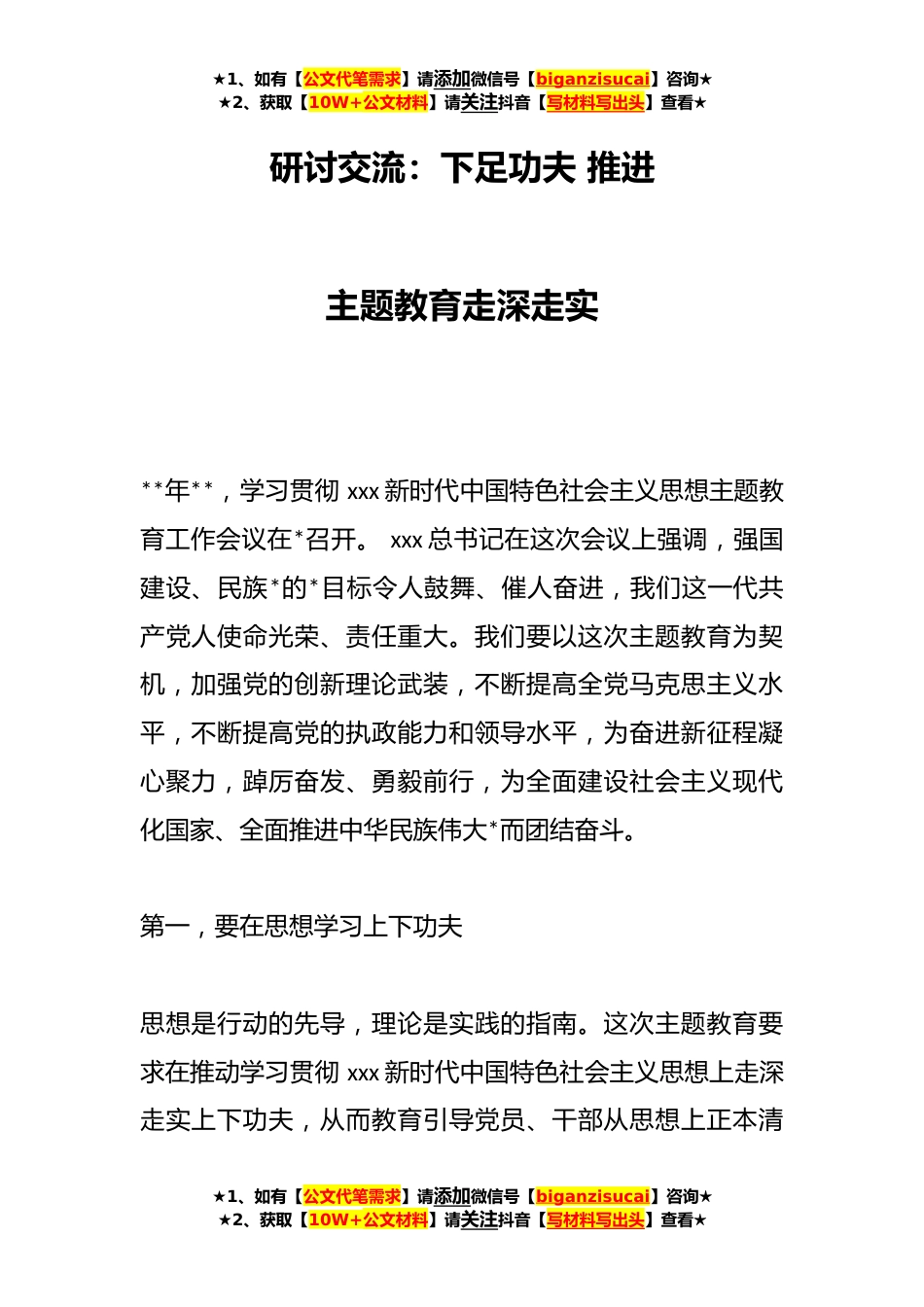 ★1、如有【公文代笔需求】请添加微信号【biganzisucai】咨询★★2、获取【10W+公文材料】请关注抖音【写材料写出头】查看★研讨交流:下足功夫推进主题教育走深走实**年**,学习贯彻xxx新时代中国特色社会主义思想主题教育工作会议在*召开。xxx总书记在这次会议上强调,强国建设、民族*的*目标令人鼓舞、催人奋进,我们这一代共产党人使命光荣、责任重大。我们要以这次主题教育为契机,加强党的创新理论武装,不断提高全党马克思主义水平,不断提高党的执政能力和领导水平,为奋进新征程凝心聚力,踔厉奋发、勇毅前行,为全面建设社会主义现代化国家、全面推进中华民族伟大*而团结奋斗。第一,要在思想学习上下功夫思想是行动的先导,理论是实践的指南。这次主题教育要求在推动学习贯彻xxx新时代中国特色社会主义...