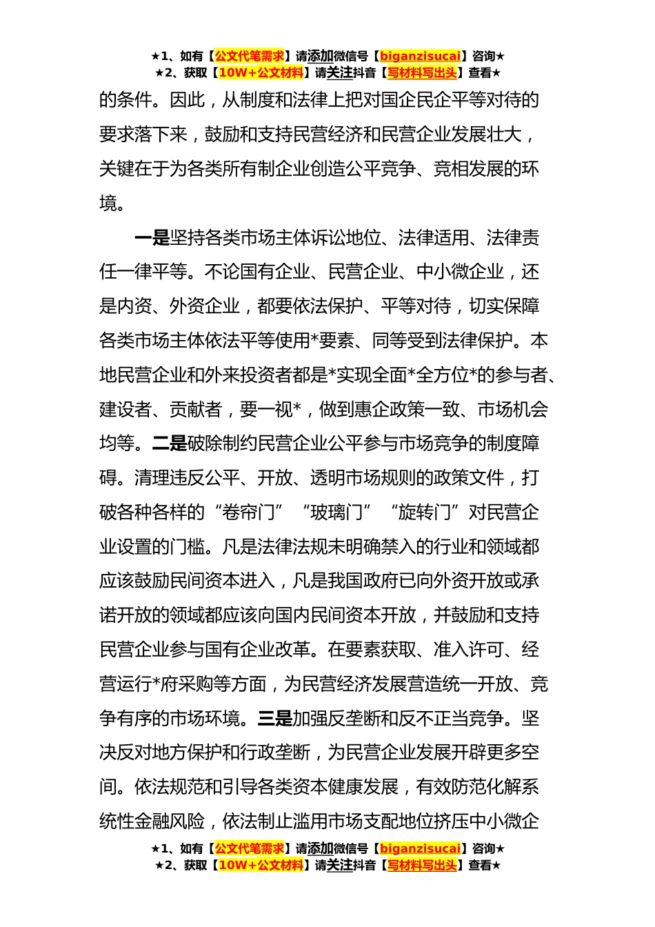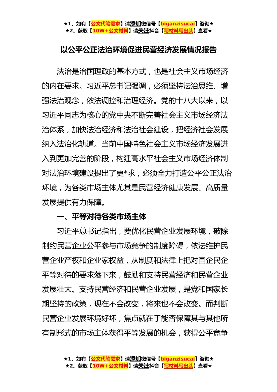 ★1、如有【公文代笔需求】请添加微信号【biganzisucai】咨询★★2、获取【10W+公文材料】请关注抖音【写材料写出头】查看★以公平公正法治环境促进民营经济发展情况报告法治是治国理政的基本方式,也是社会主义市场经济的内在要求。习近平总书记强调,必须坚持法治思维、增强法治观念,依法调控和治理经济。党的十八大以来,以习近平同志为核心的党中央不断完善社会主义市场经济法治体系,加快法治经济和法治社会建设,把经济社会发展纳入法治化轨道。当前中国特色社会主义市场经济发展进入到更加完善的阶段,构建高水平社会主义市场经济体制对法治环境建设提出了更*求,必须全力打造公平公正法治环境,为各类市场主体尤其是民营经济健康发展、高质量发展提供有力保障。一、平等对待各类市场主体习近平总书记指出...