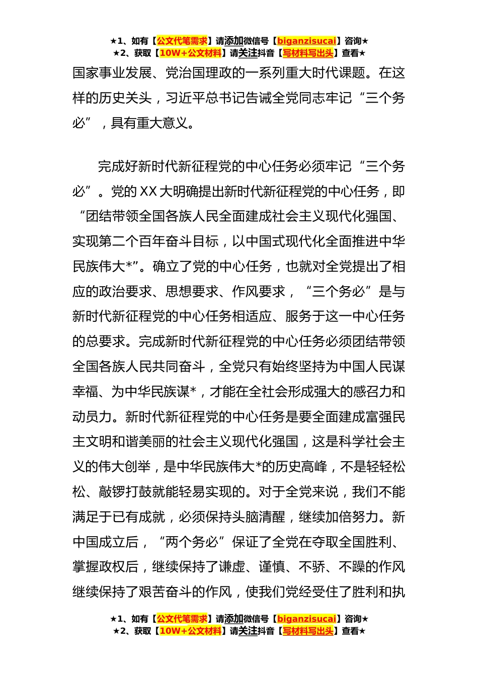 ★1、如有【公文代笔需求】请添加微信号【biganzisucai】咨询★★2、获取【10W+公文材料】请关注抖音【写材料写出头】查看★党课:深刻领会“三个务必”的重大意义同志们:习近平总书记在党的XX大报告中发出重要号召:“全党同志务必不忘初心、牢记使命,务必谦虚谨慎、艰苦奋斗,务必敢于斗争、善于斗争,坚定历史自信,增强历史主动,谱写新时代中国特色社会主义更加绚丽的华章。”中国共产党已走过百年奋斗历程,站在了新的历史起点上“三个务必”是党踏上新的赶考之路的思想动员,有着深厚的历史和时代内涵,是党创造新的伟业的重要遵循。一、“三个务必”是在新时代新征程关键时刻提出的重大要求新中国成立前夕,在党即将赢得革命胜利、夺取全国政权的重大转折关头,深谙历史之道与历史之变的毛泽东同志,清...
