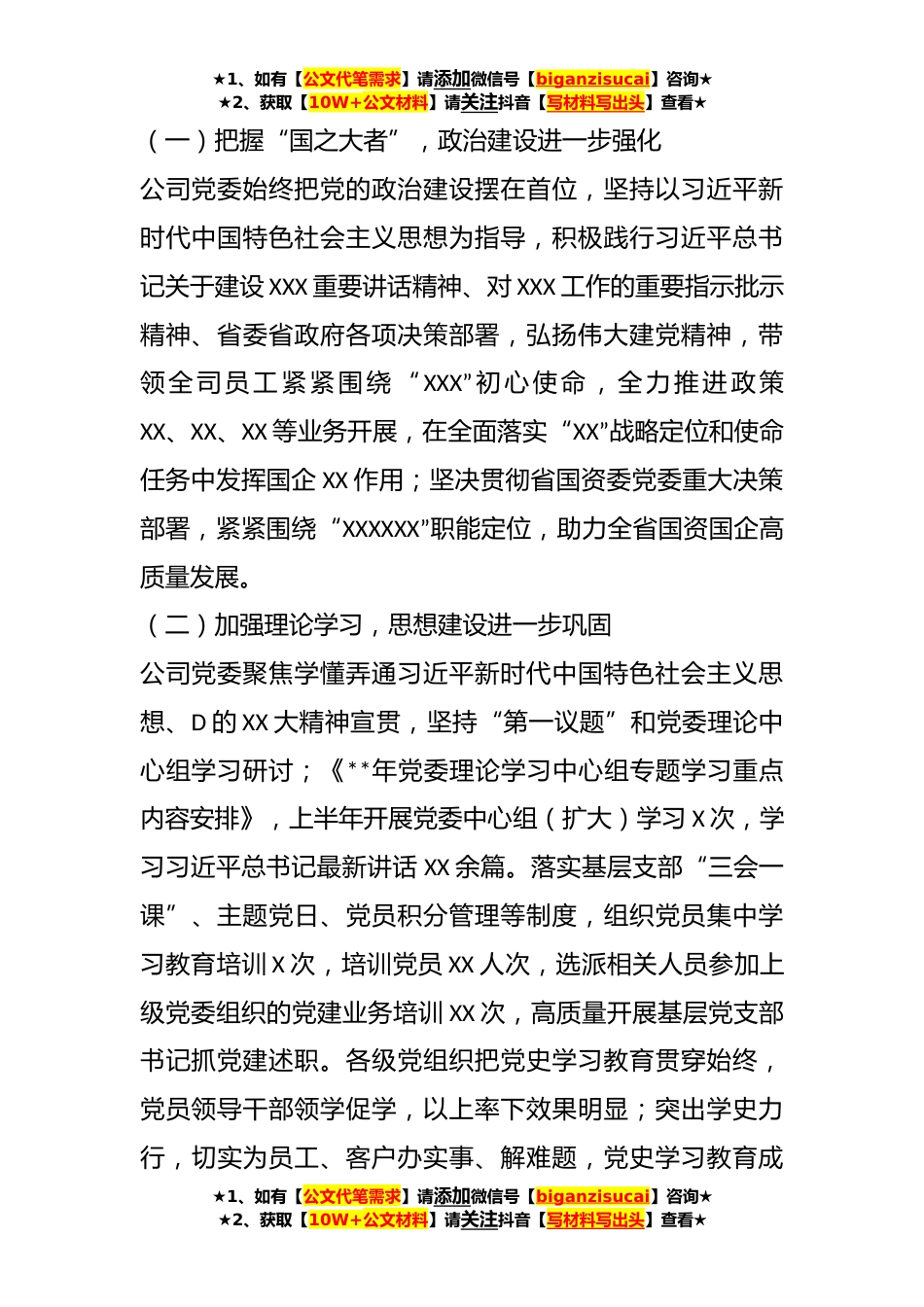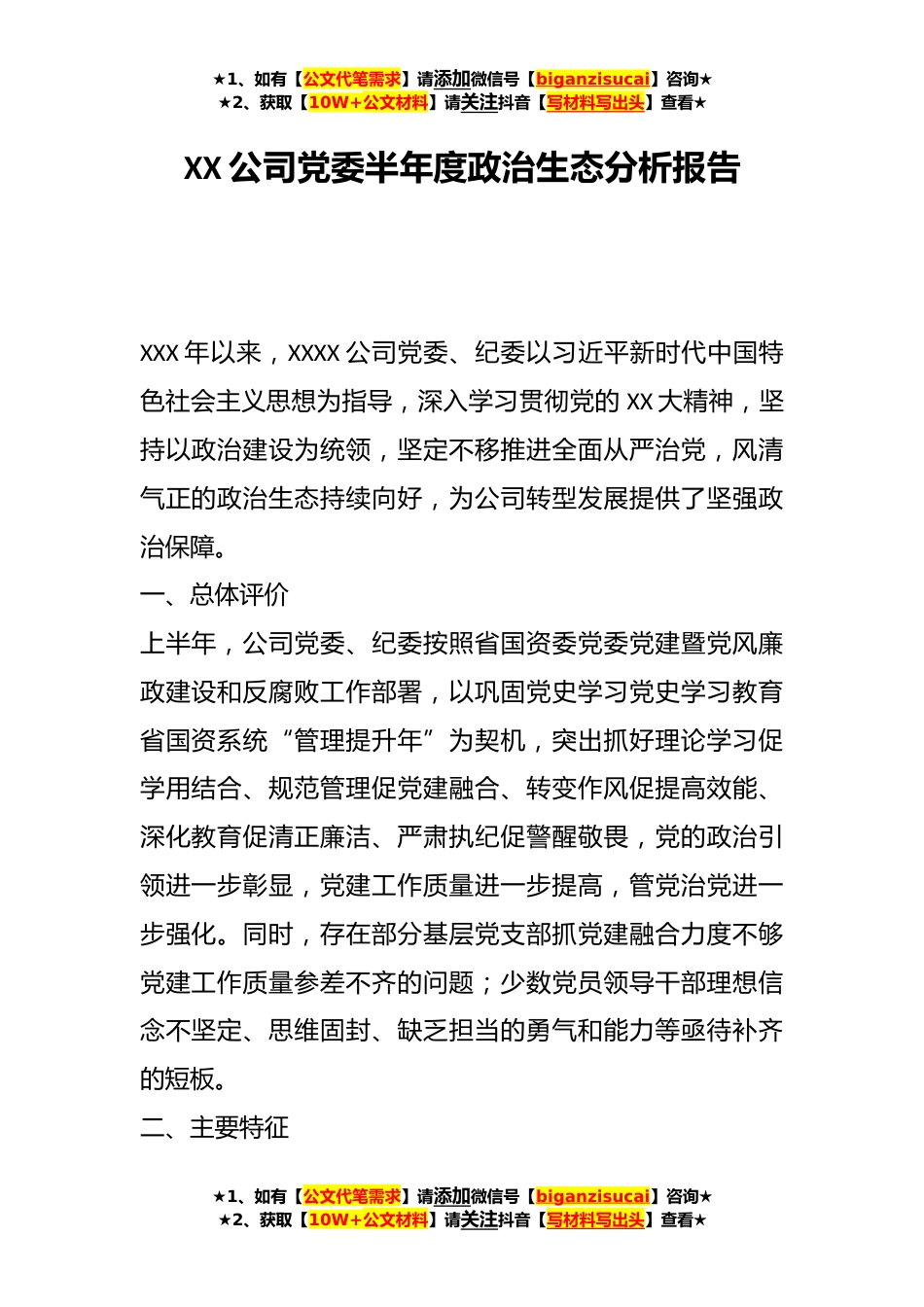 ★1、如有【公文代笔需求】请添加微信号【biganzisucai】咨询★★2、获取【10W+公文材料】请关注抖音【写材料写出头】查看★XX公司党委半年度政治生态分析报告XXX年以来,XXXX公司党委、纪委以习近平新时代中国特色社会主义思想为指导,深入学习贯彻党的XX大精神,坚持以政治建设为统领,坚定不移推进全面从严治党,风清气正的政治生态持续向好,为公司转型发展提供了坚强政治保障。一、总体评价上半年,公司党委、纪委按照省国资委党委党建暨党风廉政建设和反腐败工作部署,以巩固党史学习党史学习教育省国资系统“管理提升年”为契机,突出抓好理论学习促学用结合、规范管理促党建融合、转变作风促提高效能、深化教育促清正廉洁、严肃执纪促警醒敬畏,党的政治引领进一步彰显,党建工作质量进一步提高,管党治党...