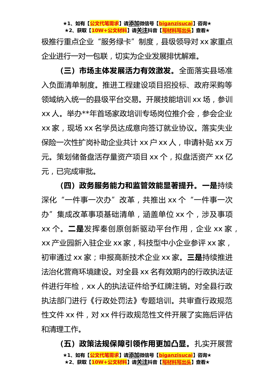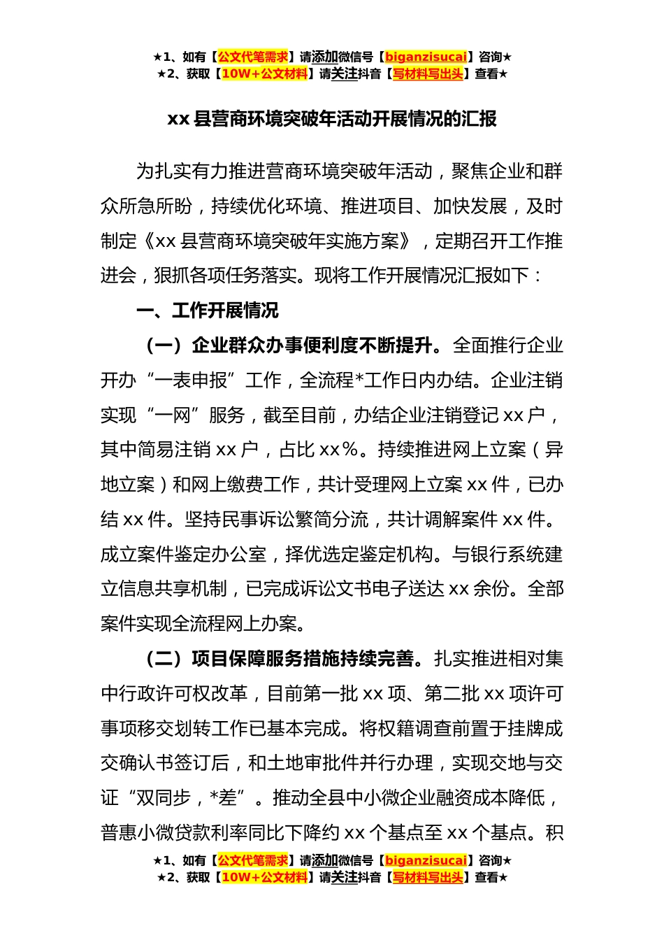 ★1、如有【公文代笔需求】请添加微信号【biganzisucai】咨询★★2、获取【10W+公文材料】请关注抖音【写材料写出头】查看★xx县营商环境突破年活动开展情况的汇报为扎实有力推进营商环境突破年活动,聚焦企业和群众所急所盼,持续优化环境、推进项目、加快发展,及时制定《xx县营商环境突破年实施方案》,定期召开工作推进会,狠抓各项任务落实。现将工作开展情况汇报如下:一、工作开展情况(一)企业群众办事便利度不断提升。全面推行企业开办“一表申报”工作,全流程*工作日内办结。企业注销实现“一网”服务,截至目前,办结企业注销登记xx户,其中简易注销xx户,占比xx%。持续推进网上立案(异地立案)和网上缴费工作,共计受理网上立案xx件,已办结xx件。坚持民事诉讼繁简分流,共计调解案件xx件。成立案...