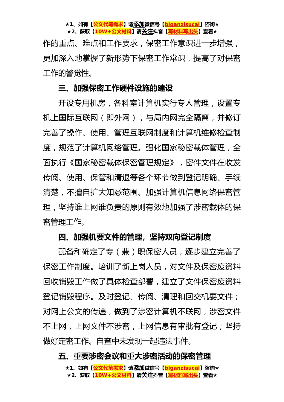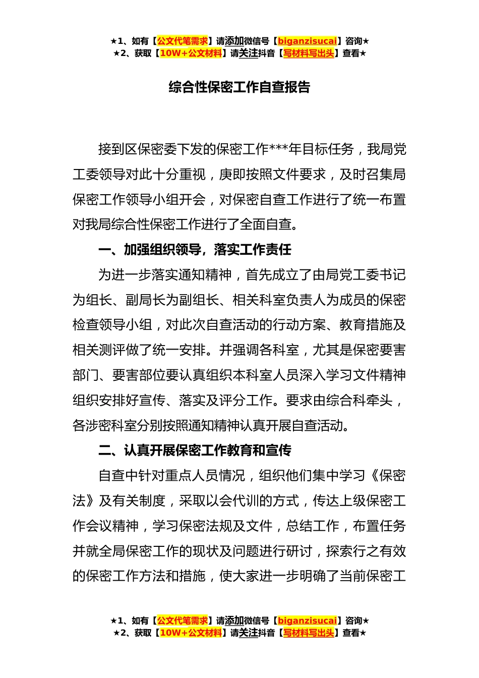 ★1、如有【公文代笔需求】请添加微信号【biganzisucai】咨询★★2、获取【10W+公文材料】请关注抖音【写材料写出头】查看★综合性保密工作自查报告接到区保密委下发的保密工作***年目标任务,我局党工委领导对此十分重视,庚即按照文件要求,及时召集局保密工作领导小组开会,对保密自查工作进行了统一布置对我局综合性保密工作进行了全面自查。一、加强组织领导,落实工作责任为进一步落实通知精神,首先成立了由局党工委书记为组长、副局长为副组长、相关科室负责人为成员的保密检查领导小组,对此次自查活动的行动方案、教育措施及相关测评做了统一安排。并强调各科室,尤其是保密要害部门、要害部位要认真组织本科室人员深入学习文件精神组织安排好宣传、落实及评分工作。要求由综合科牵头,各涉密科室分别按...