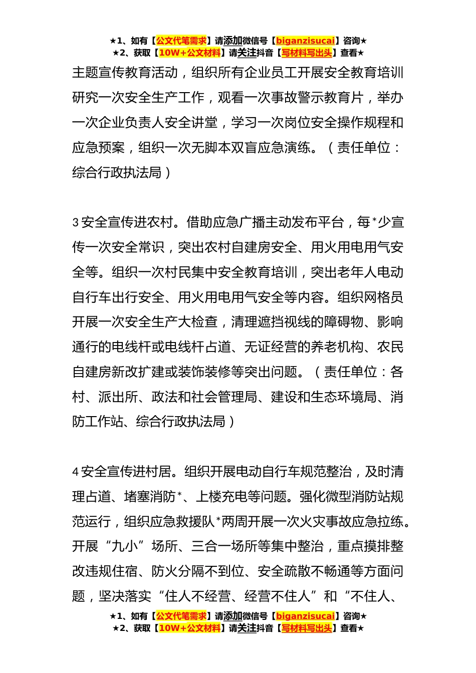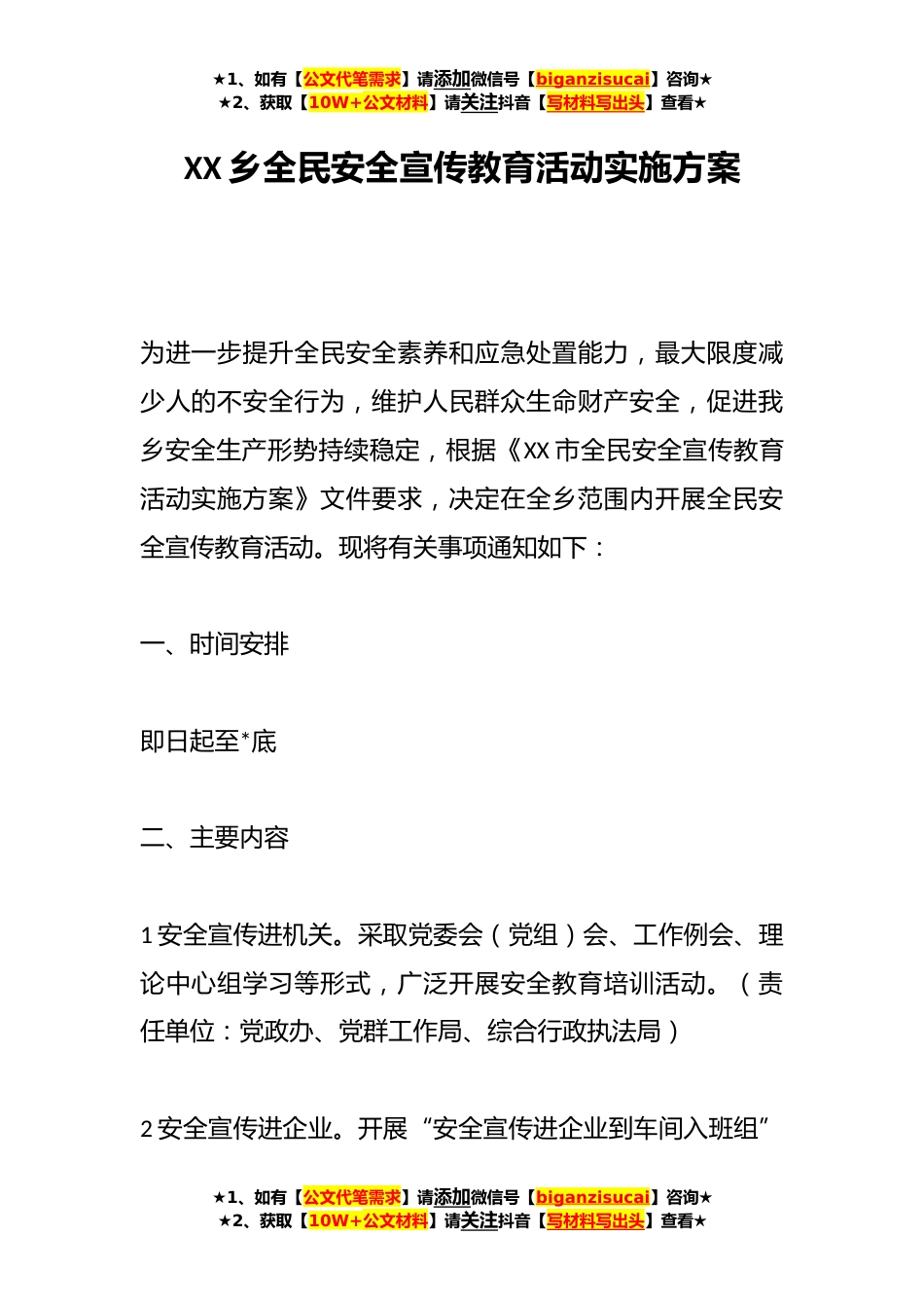 ★1、如有【公文代笔需求】请添加微信号【biganzisucai】咨询★★2、获取【10W+公文材料】请关注抖音【写材料写出头】查看★XX乡全民安全宣传教育活动实施方案为进一步提升全民安全素养和应急处置能力,最大限度减少人的不安全行为,维护人民群众生命财产安全,促进我乡安全生产形势持续稳定,根据《XX市全民安全宣传教育活动实施方案》文件要求,决定在全乡范围内开展全民安全宣传教育活动。现将有关事项通知如下:一、时间安排即日起至*底二、主要内容1安全宣传进机关。采取党委会(党组)会、工作例会、理论中心组学习等形式,广泛开展安全教育培训活动。(责任单位:党政办、党群工作局、综合行政执法局)2安全宣传进企业。开展“安全宣传进企业到车间入班组”★1、如有【公文代笔需求】请添加微信号【biganzi...