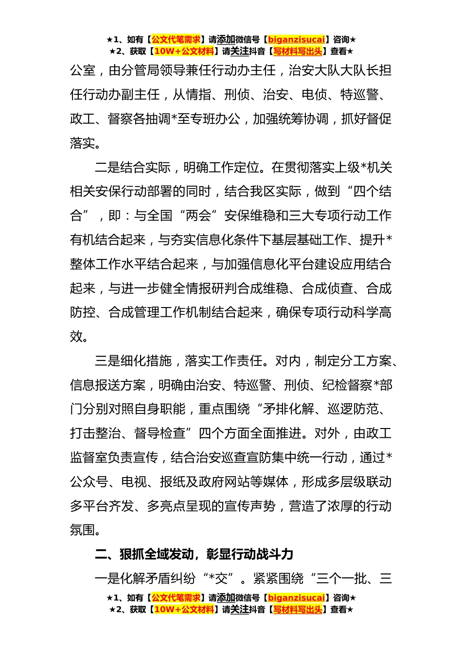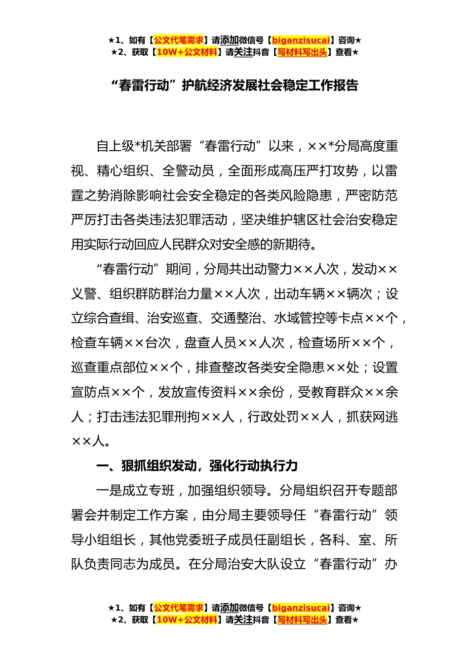 ★1、如有【公文代笔需求】请添加微信号【biganzisucai】咨询★★2、获取【10W+公文材料】请关注抖音【写材料写出头】查看★“春雷行动”护航经济发展社会稳定工作报告自上级*机关部署“春雷行动”以来,××*分局高度重视、精心组织、全警动员,全面形成高压严打攻势,以雷霆之势消除影响社会安全稳定的各类风险隐患,严密防范严厉打击各类违法犯罪活动,坚决维护辖区社会治安稳定用实际行动回应人民群众对安全感的新期待。“春雷行动”期间,分局共出动警力××人次,发动××义警、组织群防群治力量××人次,出动车辆××辆次;设立综合查缉、治安巡查、交通整治、水域管控等卡点××个,检查车辆××台次,盘查人员××人次,检查场所××个,巡查重点部位××个,排查整改各类安全隐患××处;设置宣防点×...