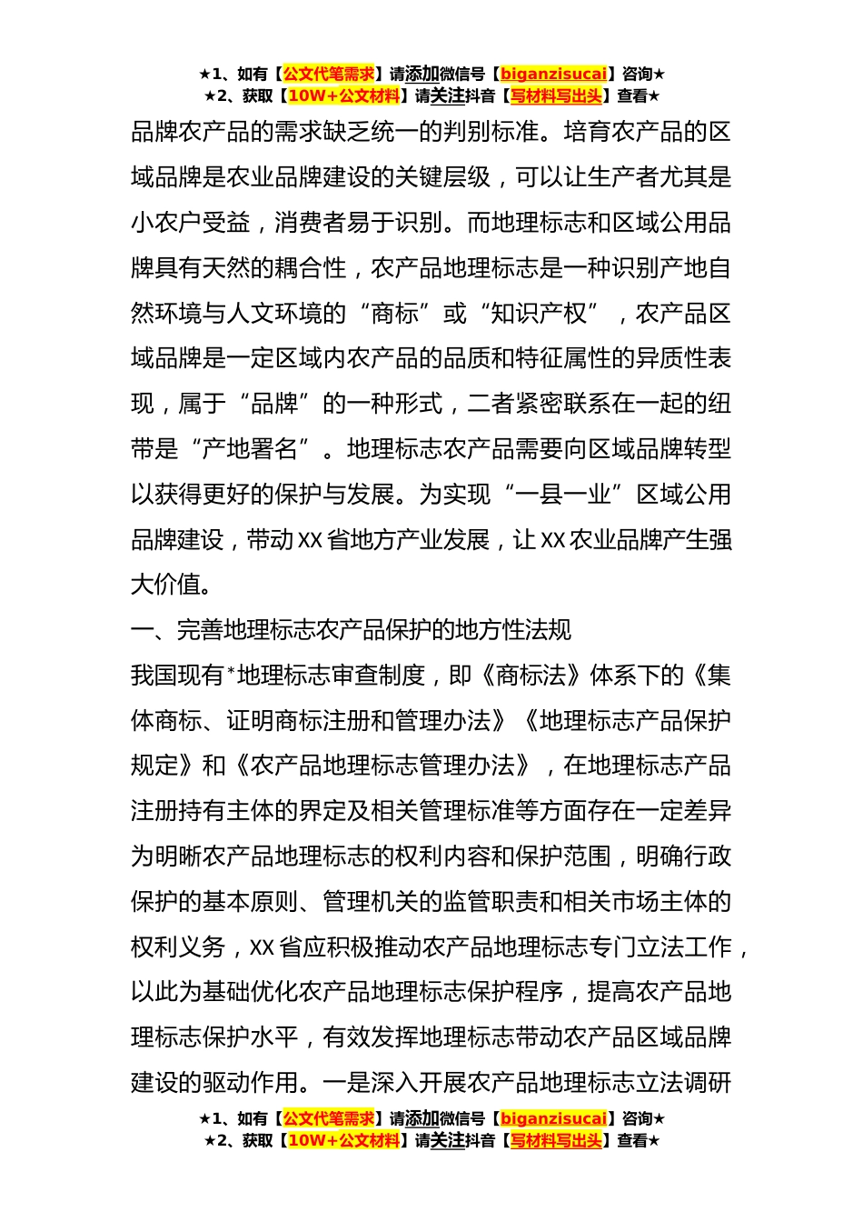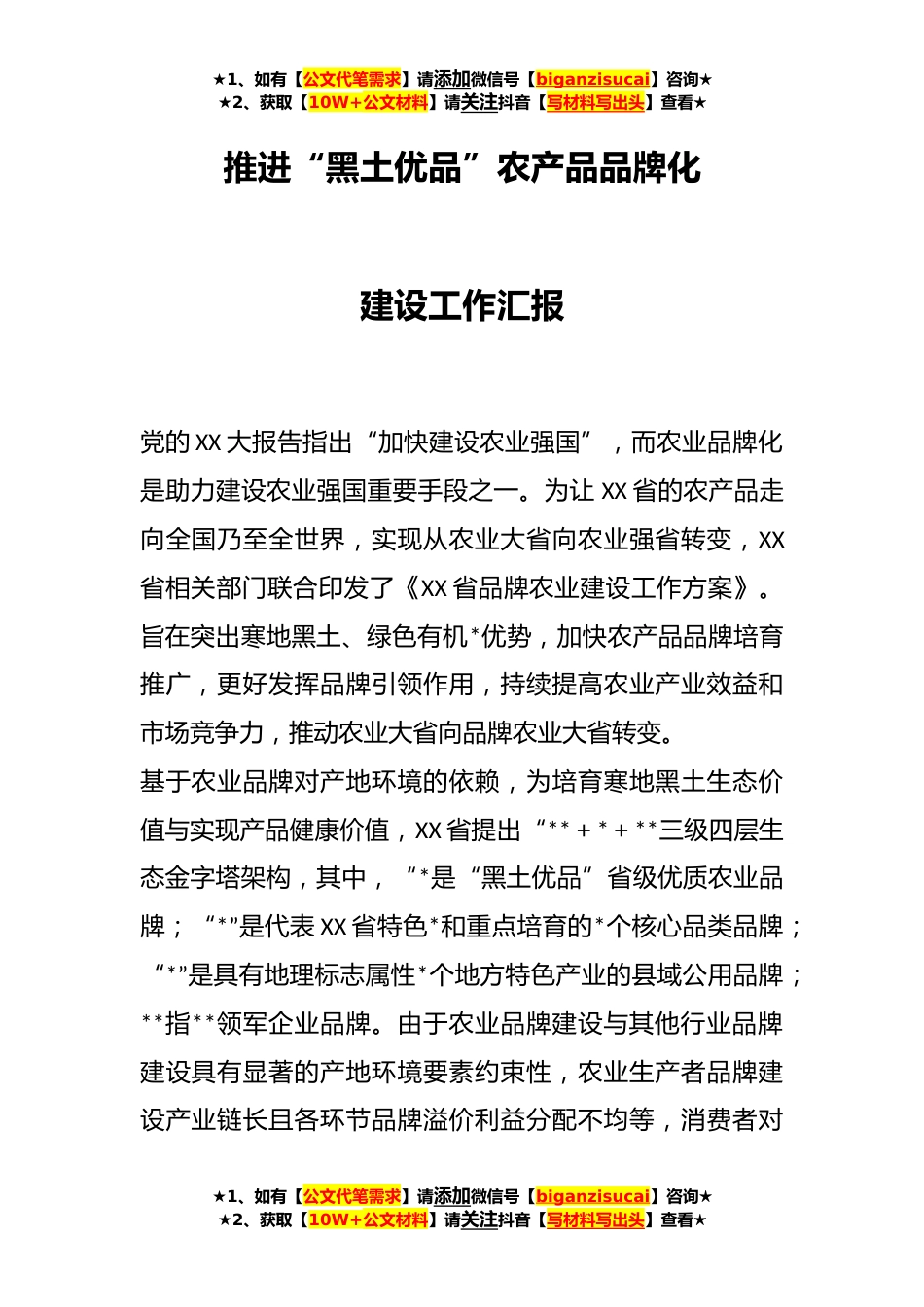 ★1、如有【公文代笔需求】请添加微信号【biganzisucai】咨询★★2、获取【10W+公文材料】请关注抖音【写材料写出头】查看★推进“黑土优品”农产品品牌化建设工作汇报党的XX大报告指出“加快建设农业强国”,而农业品牌化是助力建设农业强国重要手段之一。为让XX省的农产品走向全国乃至全世界,实现从农业大省向农业强省转变,XX省相关部门联合印发了《XX省品牌农业建设工作方案》。旨在突出寒地黑土、绿色有机*优势,加快农产品品牌培育推广,更好发挥品牌引领作用,持续提高农业产业效益和市场竞争力,推动农业大省向品牌农业大省转变。基于农业品牌对产地环境的依赖,为培育寒地黑土生态价值与实现产品健康价值,XX省提出“**+*+**三级四层生态金字塔架构,其中,“*是“黑土优品”省级优质农业品牌;“*”...
