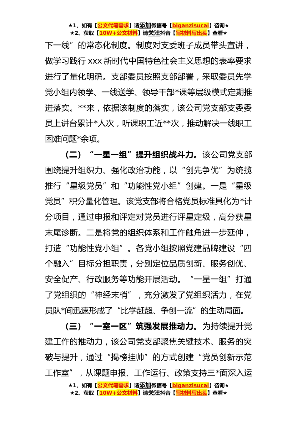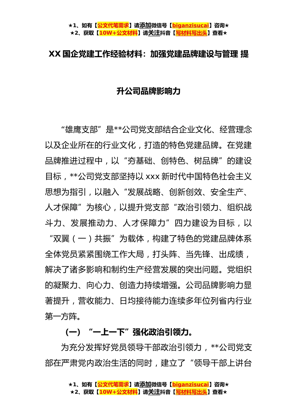 ★1、如有【公文代笔需求】请添加微信号【biganzisucai】咨询★★2、获取【10W+公文材料】请关注抖音【写材料写出头】查看★XX国企党建工作经验材料:加强党建品牌建设与管理提升公司品牌影响力“雄鹰支部”是**公司党支部结合企业文化、经营理念以及企业所在的行业文化,打造的特色党建品牌。在党建品牌推进过程中,以“夯基础、创特色、树品牌”的建设目标,**公司党支部坚持以xxx新时代中国特色社会主义思想为指引,以融入“发展战略、创新创效、安全生产、人才保障”为核心,以提升党支部“政治引领力、组织战斗力、发展推动力、人才保障力”四力建设为目标,以“双翼(一)共振”为载体,构建了特色的党建品牌体系全体党员紧紧围绕工作大局,打头阵、当先锋、出成绩,解决了诸多影响和制约生产经营发展的突出...