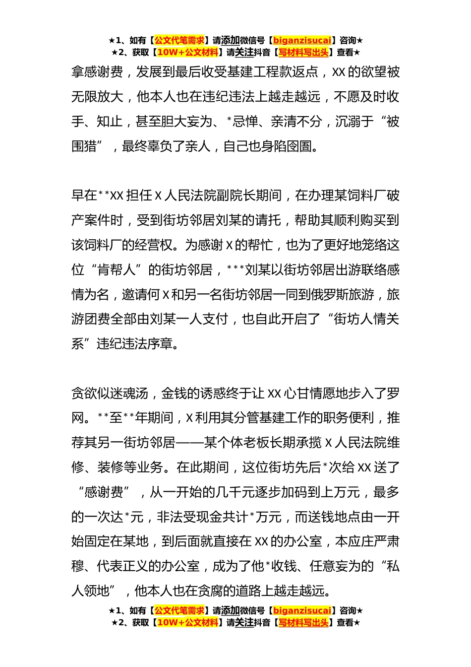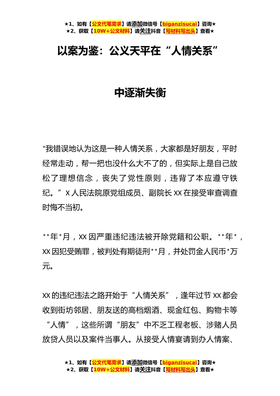 ★1、如有【公文代笔需求】请添加微信号【biganzisucai】咨询★★2、获取【10W+公文材料】请关注抖音【写材料写出头】查看★以案为鉴:公义天平在“人情关系”中逐渐失衡“我错误地认为这是一种人情关系,大家都是好朋友,平时经常走动,帮一把也没什么大不了的,但实际上是自己放松了理想信念,丧失了党性原则,违背了本应遵守铁纪。”X人民法院原党组成员、副院长XX在接受审查调查时悔不当初。**年*月,XX因严重违纪违法被开除党籍和公职。**年*,XX因犯受贿罪,被判处有期徒刑**月,并处罚金人民币*万元。XX的违纪违法之路开始于“人情关系”,逢年过节XX都会收到街坊邻居、朋友送的高档烟酒、现金红包、购物卡等“人情”,这些所谓“朋友”中不乏工程老板、涉赌人员放贷人员以及案件当事人。从接受人情宴请到...