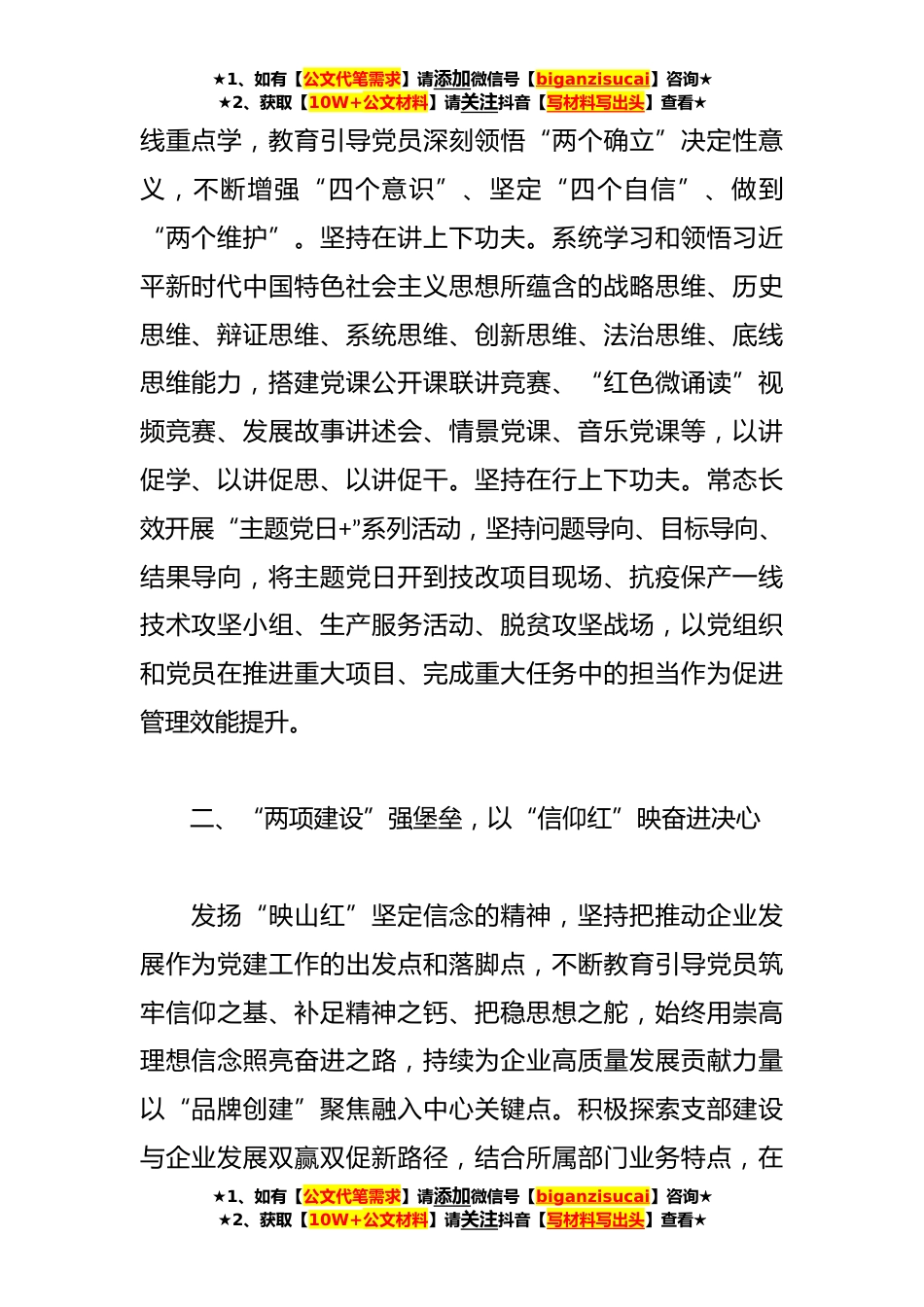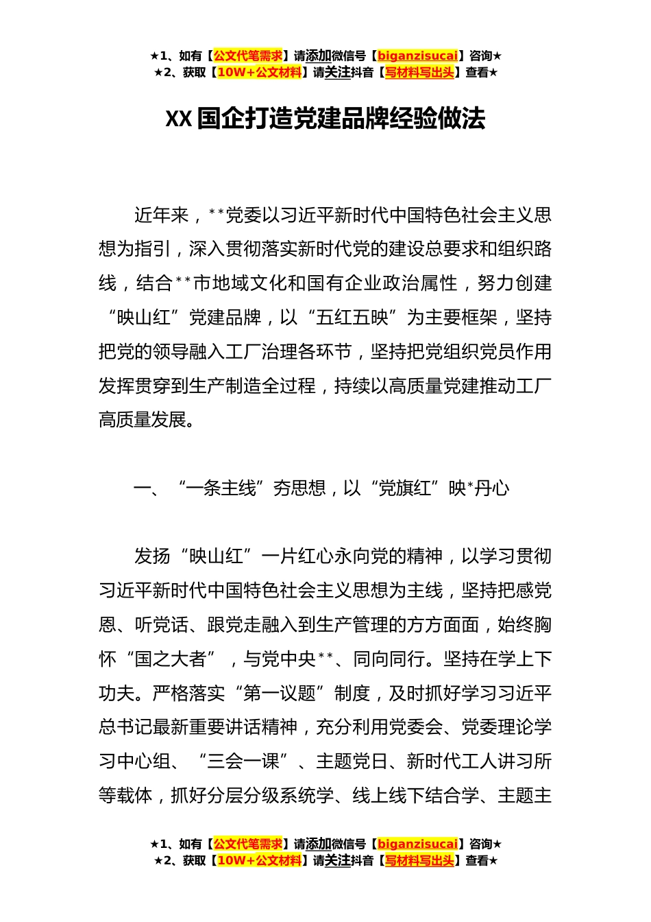 ★1、如有【公文代笔需求】请添加微信号【biganzisucai】咨询★★2、获取【10W+公文材料】请关注抖音【写材料写出头】查看★XX国企打造党建品牌经验做法近年来,**党委以习近平新时代中国特色社会主义思想为指引,深入贯彻落实新时代党的建设总要求和组织路线,结合**市地域文化和国有企业政治属性,努力创建“映山红”党建品牌,以“五红五映”为主要框架,坚持把党的领导融入工厂治理各环节,坚持把党组织党员作用发挥贯穿到生产制造全过程,持续以高质量党建推动工厂高质量发展。一、“一条主线”夯思想,以“党旗红”映*丹心发扬“映山红”一片红心永向党的精神,以学习贯彻习近平新时代中国特色社会主义思想为主线,坚持把感党恩、听党话、跟党走融入到生产管理的方方面面,始终胸怀“国之大者”,与党中央**...