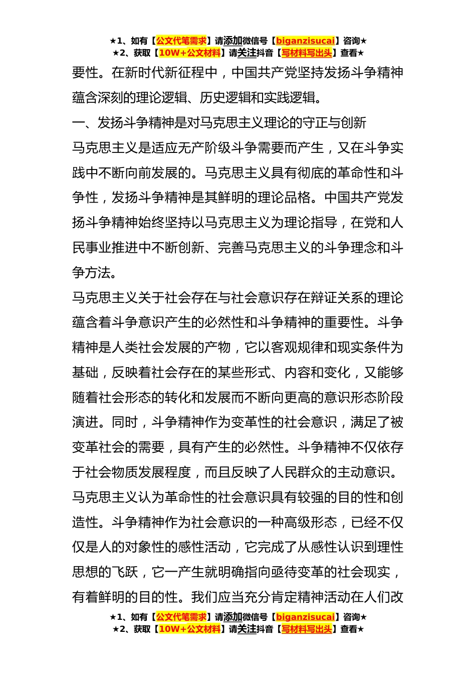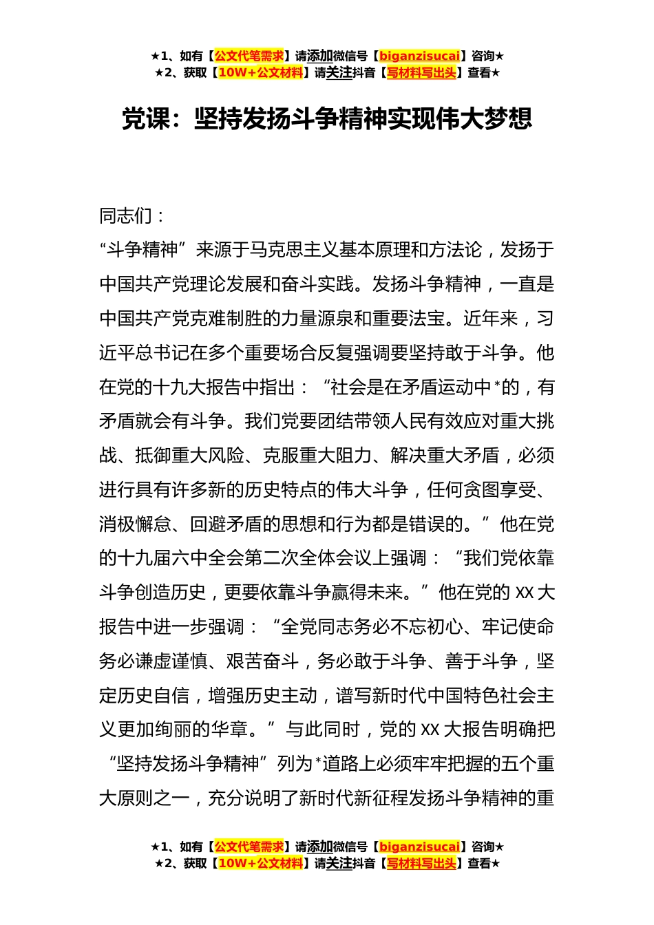 ★1、如有【公文代笔需求】请添加微信号【biganzisucai】咨询★★2、获取【10W+公文材料】请关注抖音【写材料写出头】查看★党课:坚持发扬斗争精神实现伟大梦想同志们:“斗争精神”来源于马克思主义基本原理和方法论,发扬于中国共产党理论发展和奋斗实践。发扬斗争精神,一直是中国共产党克难制胜的力量源泉和重要法宝。近年来,习近平总书记在多个重要场合反复强调要坚持敢于斗争。他在党的十九大报告中指出:“社会是在矛盾运动中*的,有矛盾就会有斗争。我们党要团结带领人民有效应对重大挑战、抵御重大风险、克服重大阻力、解决重大矛盾,必须进行具有许多新的历史特点的伟大斗争,任何贪图享受、消极懈怠、回避矛盾的思想和行为都是错误的。”他在党的十九届六中全会第二次全体会议上强调:“我们党依靠斗...