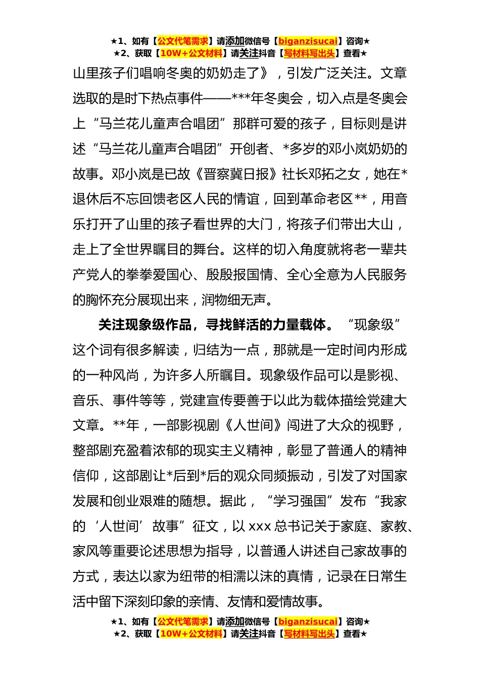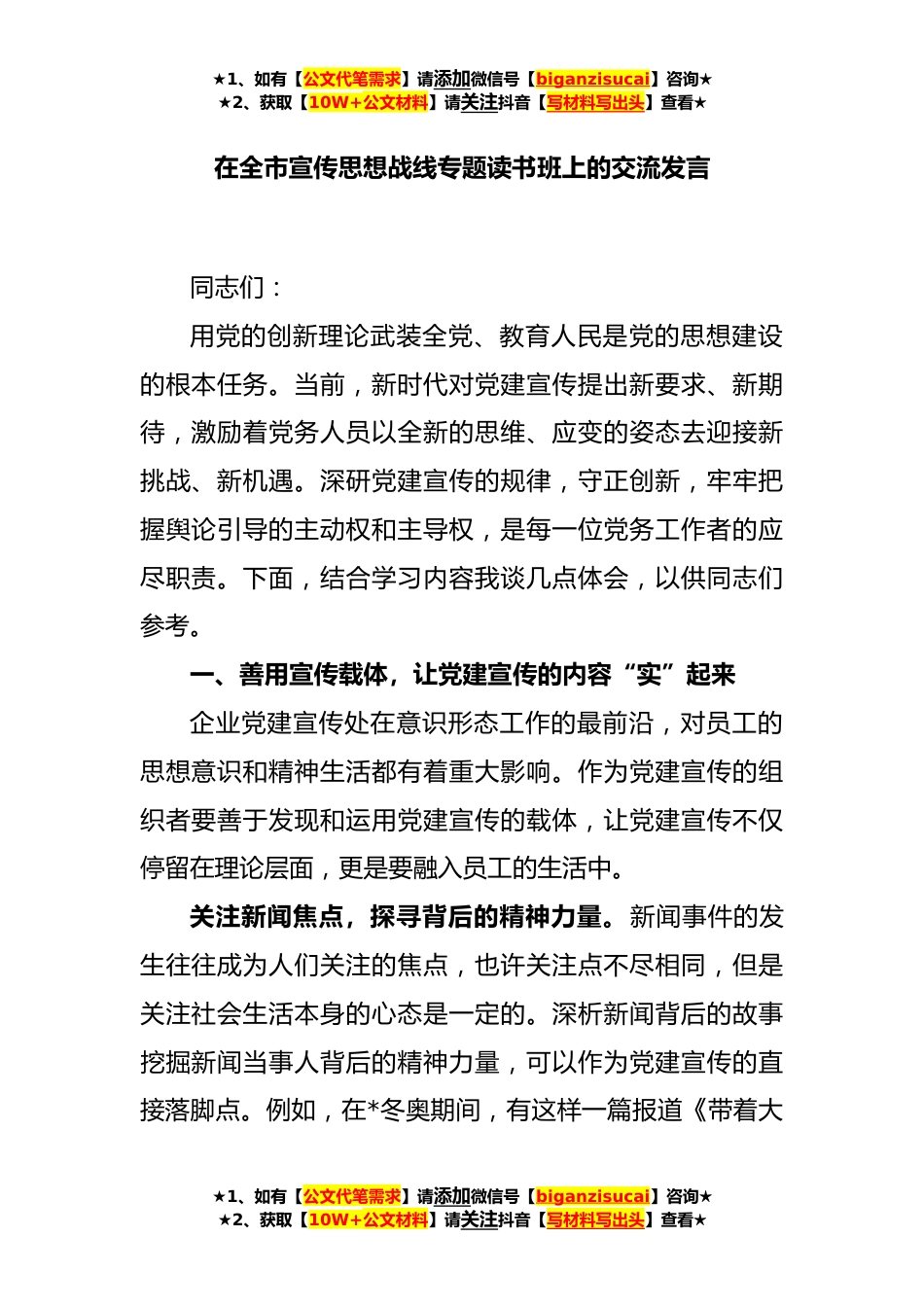 ★1、如有【公文代笔需求】请添加微信号【biganzisucai】咨询★★2、获取【10W+公文材料】请关注抖音【写材料写出头】查看★在全市宣传思想战线专题读书班上的交流发言同志们:用党的创新理论武装全党、教育人民是党的思想建设的根本任务。当前,新时代对党建宣传提出新要求、新期待,激励着党务人员以全新的思维、应变的姿态去迎接新挑战、新机遇。深研党建宣传的规律,守正创新,牢牢把握舆论引导的主动权和主导权,是每一位党务工作者的应尽职责。下面,结合学习内容我谈几点体会,以供同志们参考。一、善用宣传载体,让党建宣传的内容“实”起来企业党建宣传处在意识形态工作的最前沿,对员工的思想意识和精神生活都有着重大影响。作为党建宣传的组织者要善于发现和运用党建宣传的载体,让党建宣传不仅停留在...