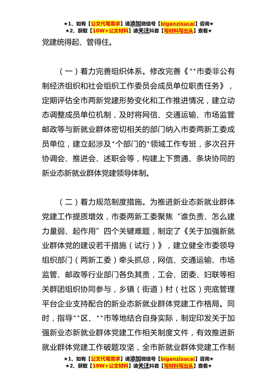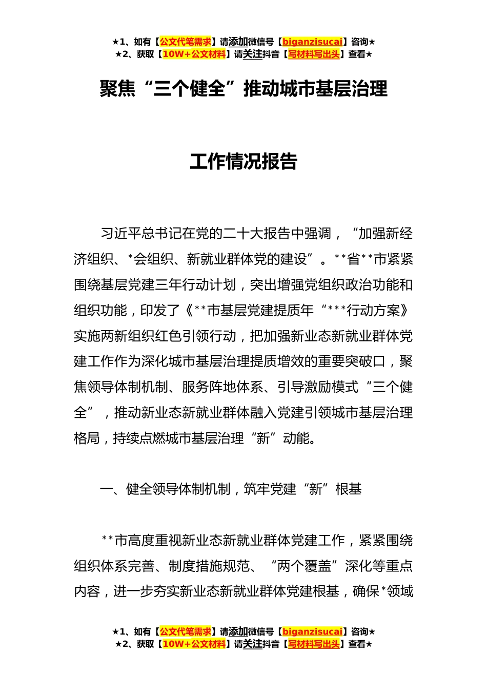 ★1、如有【公文代笔需求】请添加微信号【biganzisucai】咨询★★2、获取【10W+公文材料】请关注抖音【写材料写出头】查看★聚焦“三个健全”推动城市基层治理工作情况报告习近平总书记在党的二十大报告中强调,“加强新经济组织、*会组织、新就业群体党的建设”。**省**市紧紧围绕基层党建三年行动计划,突出增强党组织政治功能和组织功能,印发了《**市基层党建提质年“***行动方案》实施两新组织红色引领行动,把加强新业态新就业群体党建工作作为深化城市基层治理提质增效的重要突破口,聚焦领导体制机制、服务阵地体系、引导激励模式“三个健全”,推动新业态新就业群体融入党建引领城市基层治理格局,持续点燃城市基层治理“新”动能。一、健全领导体制机制,筑牢党建“新”根基**市高度重视新业态新就业群...