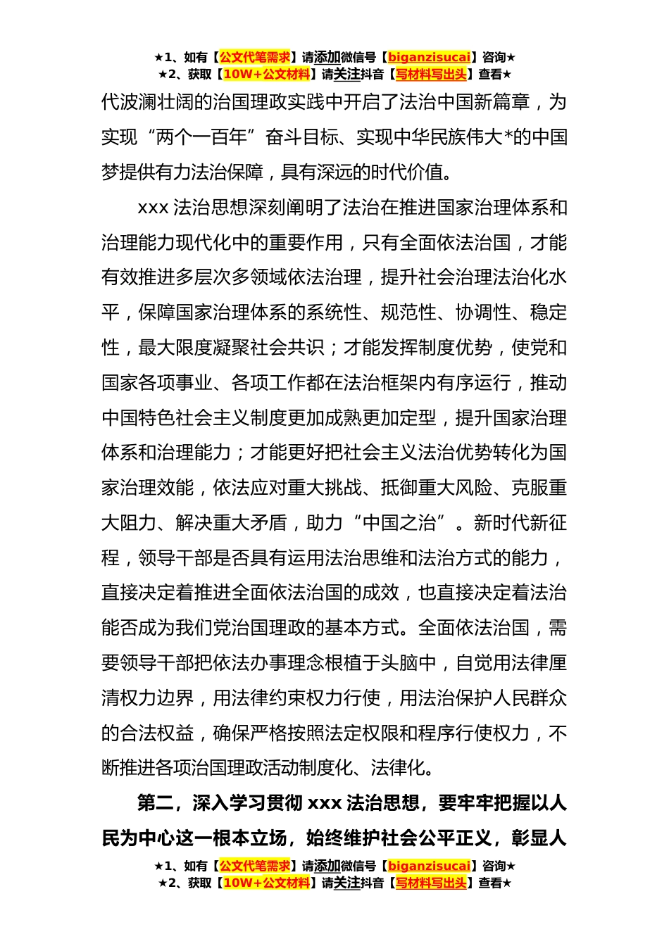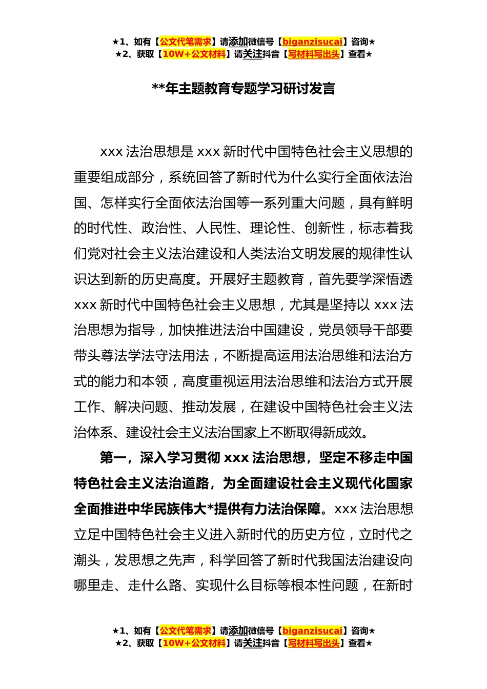 ★1、如有【公文代笔需求】请添加微信号【biganzisucai】咨询★★2、获取【10W+公文材料】请关注抖音【写材料写出头】查看★**年主题教育专题学习研讨发言xxx法治思想是xxx新时代中国特色社会主义思想的重要组成部分,系统回答了新时代为什么实行全面依法治国、怎样实行全面依法治国等一系列重大问题,具有鲜明的时代性、政治性、人民性、理论性、创新性,标志着我们党对社会主义法治建设和人类法治文明发展的规律性认识达到新的历史高度。开展好主题教育,首先要学深悟透xxx新时代中国特色社会主义思想,尤其是坚持以xxx法治思想为指导,加快推进法治中国建设,党员领导干部要带头尊法学法守法用法,不断提高运用法治思维和法治方式的能力和本领,高度重视运用法治思维和法治方式开展工作、解决问题、推动发展,...