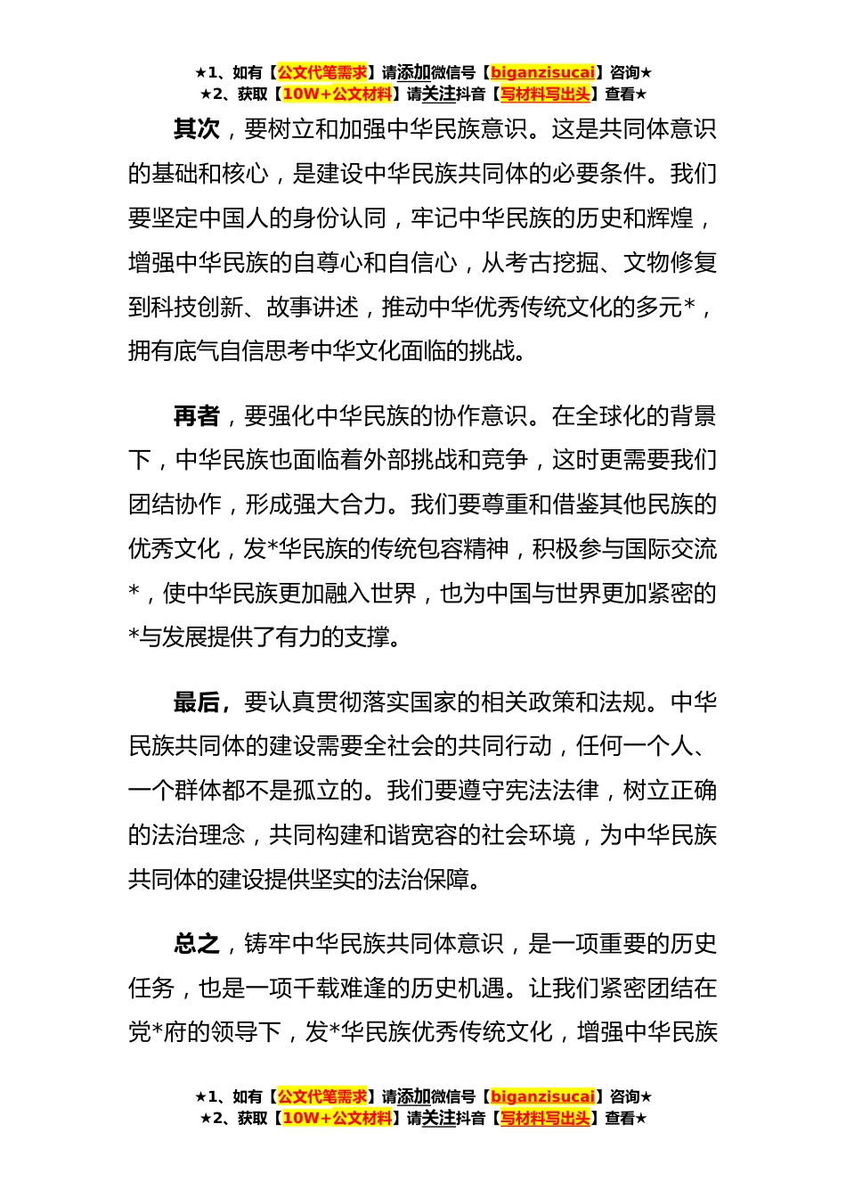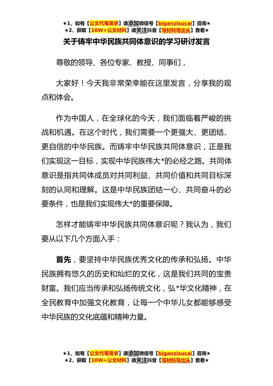★1、如有【公文代笔需求】请添加微信号【biganzisucai】咨询★★2、获取【10W+公文材料】请关注抖音【写材料写出头】查看★关于铸牢中华民族共同体意识的学习研讨发言尊敬的领导、各位专家、教授、同事们,大家好!今天我非常荣幸能在这里发言,分享我的观点和体会。作为中国人,在全球化的今天,我们面临着严峻的挑战和机遇。在这个时代,我们需要一个更强大、更团结、更自信的中华民族。而铸牢中华民族共同体意识,正是我们实现这一目标,实现中华民族伟大*的必经之路。共同体意识是指共同体成员对共同利益、共同价值和共同目标深刻的认同和理解。这是中华民族团结一心、共同奋斗的必要条件,也是我们实现伟大*的重要保障。怎样才能铸牢中华民族共同体意识呢?我认为,我们要从以下几个方面入手:首先,要坚持...