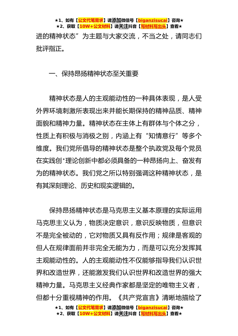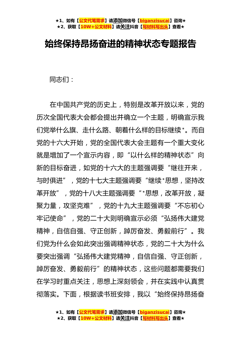 ★1、如有【公文代笔需求】请添加微信号【biganzisucai】咨询★★2、获取【10W+公文材料】请关注抖音【写材料写出头】查看★始终保持昂扬奋进的精神状态专题报告同志们:在中国共产党的历史上,特别是改革开放以来,党的历次全国代表大会都会提出并确立一个主题,明确宣示我们党举什么旗、走什么路、朝着什么样的目标继续*。而自党的十六大开始,党的全国代表大会主题有一个重大变化就是增加了一个宣示内容,即“以什么样的精神状态”向新的目标奋进,如党的十六大的主题强调要“继往开来,与时俱进”,党的十七大主题强调要“继续*思想,坚持改革开放”,党的十八大主题强调要“*思想,改革开放,凝聚力量,攻坚克难”,党的十九大主题强调要“不忘初心牢记使命”,党的二十大则明确宣示必须“弘扬伟大建党精神,...