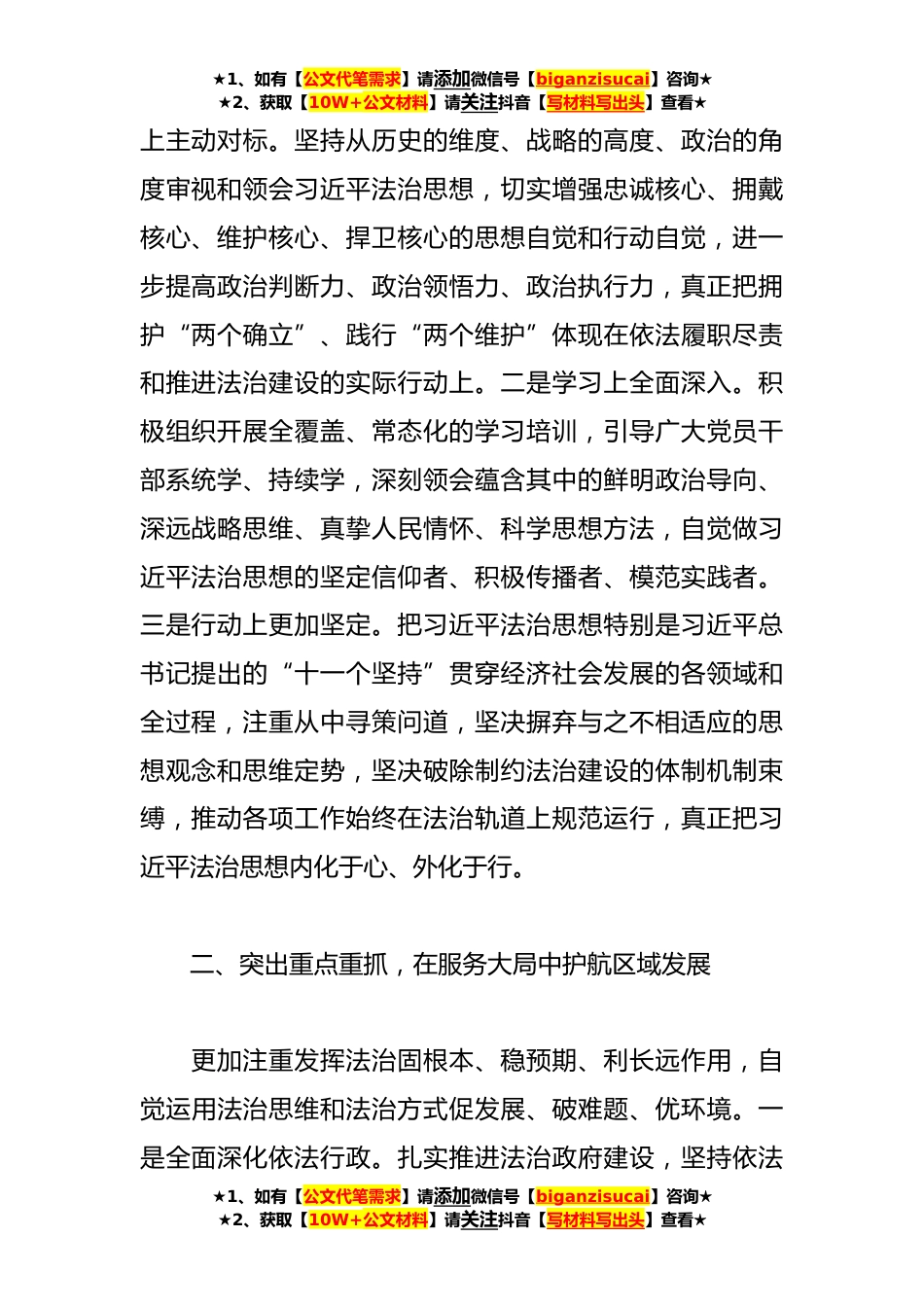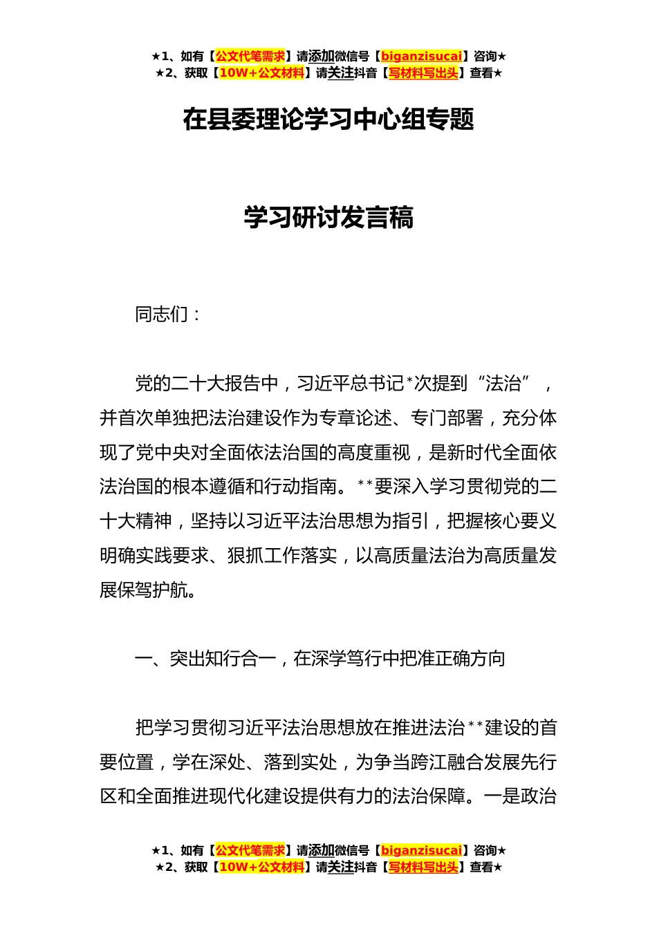 ★1、如有【公文代笔需求】请添加微信号【biganzisucai】咨询★★2、获取【10W+公文材料】请关注抖音【写材料写出头】查看★在县委理论学习中心组专题学习研讨发言稿同志们:党的二十大报告中,习近平总书记*次提到“法治”,并首次单独把法治建设作为专章论述、专门部署,充分体现了党中央对全面依法治国的高度重视,是新时代全面依法治国的根本遵循和行动指南。**要深入学习贯彻党的二十大精神,坚持以习近平法治思想为指引,把握核心要义明确实践要求、狠抓工作落实,以高质量法治为高质量发展保驾护航。一、突出知行合一,在深学笃行中把准正确方向把学习贯彻习近平法治思想放在推进法治**建设的首要位置,学在深处、落到实处,为争当跨江融合发展先行区和全面推进现代化建设提供有力的法治保障。一是政治★1...