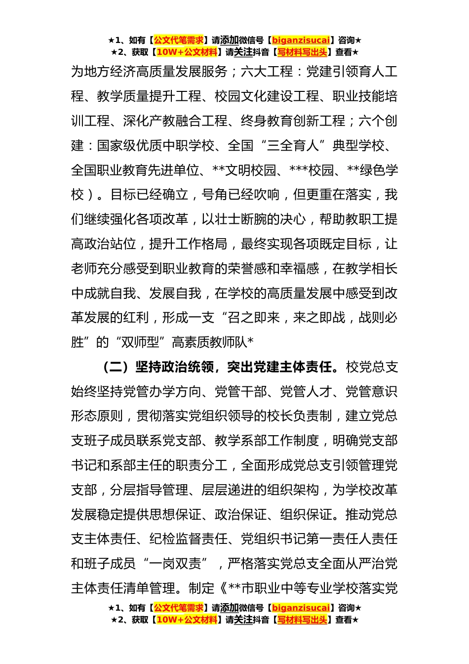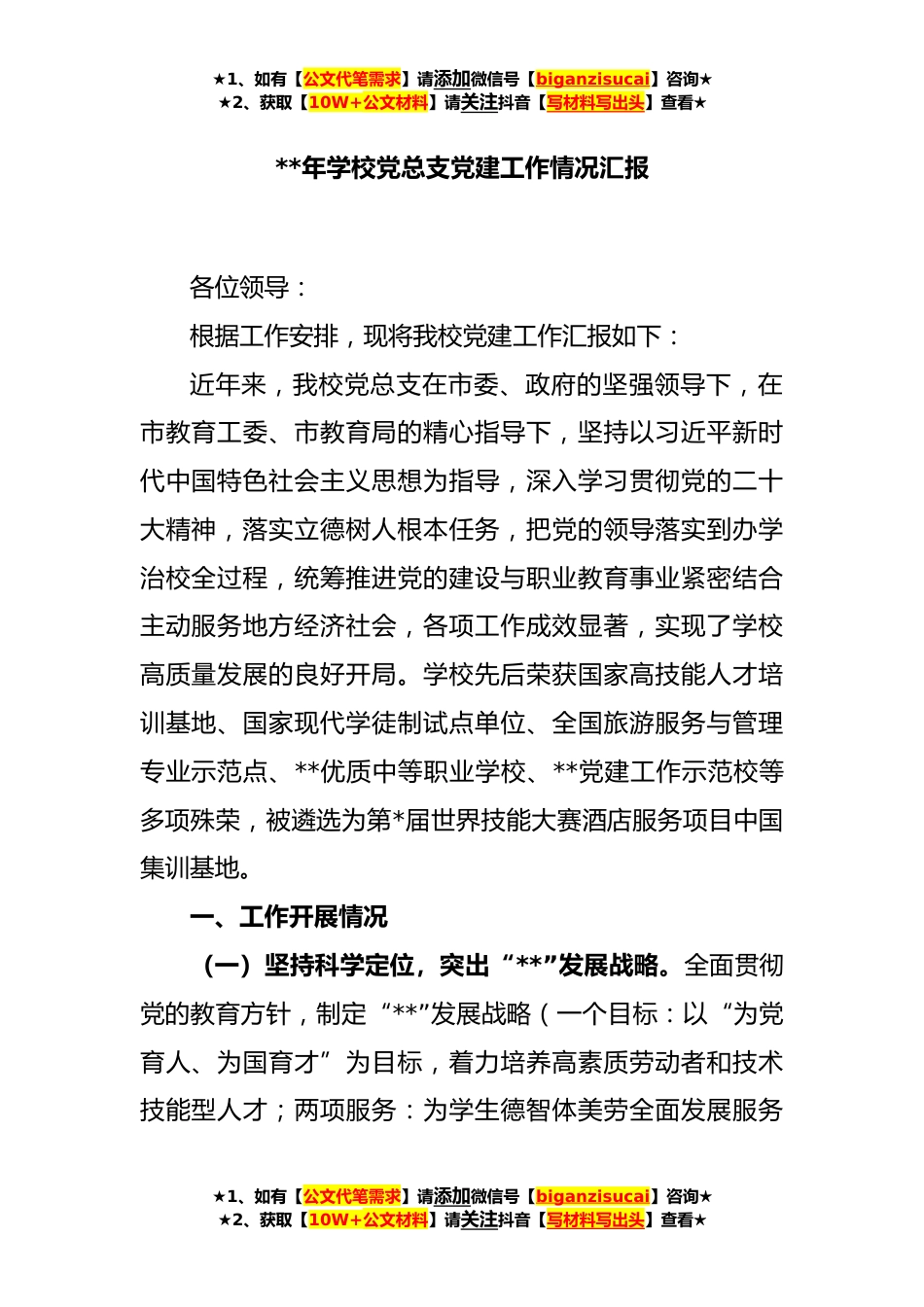★1、如有【公文代笔需求】请添加微信号【biganzisucai】咨询★★2、获取【10W+公文材料】请关注抖音【写材料写出头】查看★**年学校党总支党建工作情况汇报各位领导:根据工作安排,现将我校党建工作汇报如下:近年来,我校党总支在市委、政府的坚强领导下,在市教育工委、市教育局的精心指导下,坚持以习近平新时代中国特色社会主义思想为指导,深入学习贯彻党的二十大精神,落实立德树人根本任务,把党的领导落实到办学治校全过程,统筹推进党的建设与职业教育事业紧密结合主动服务地方经济社会,各项工作成效显著,实现了学校高质量发展的良好开局。学校先后荣获国家高技能人才培训基地、国家现代学徒制试点单位、全国旅游服务与管理专业示范点、**优质中等职业学校、**党建工作示范校等多项殊荣,被遴选为第*...