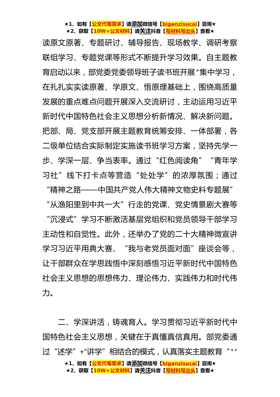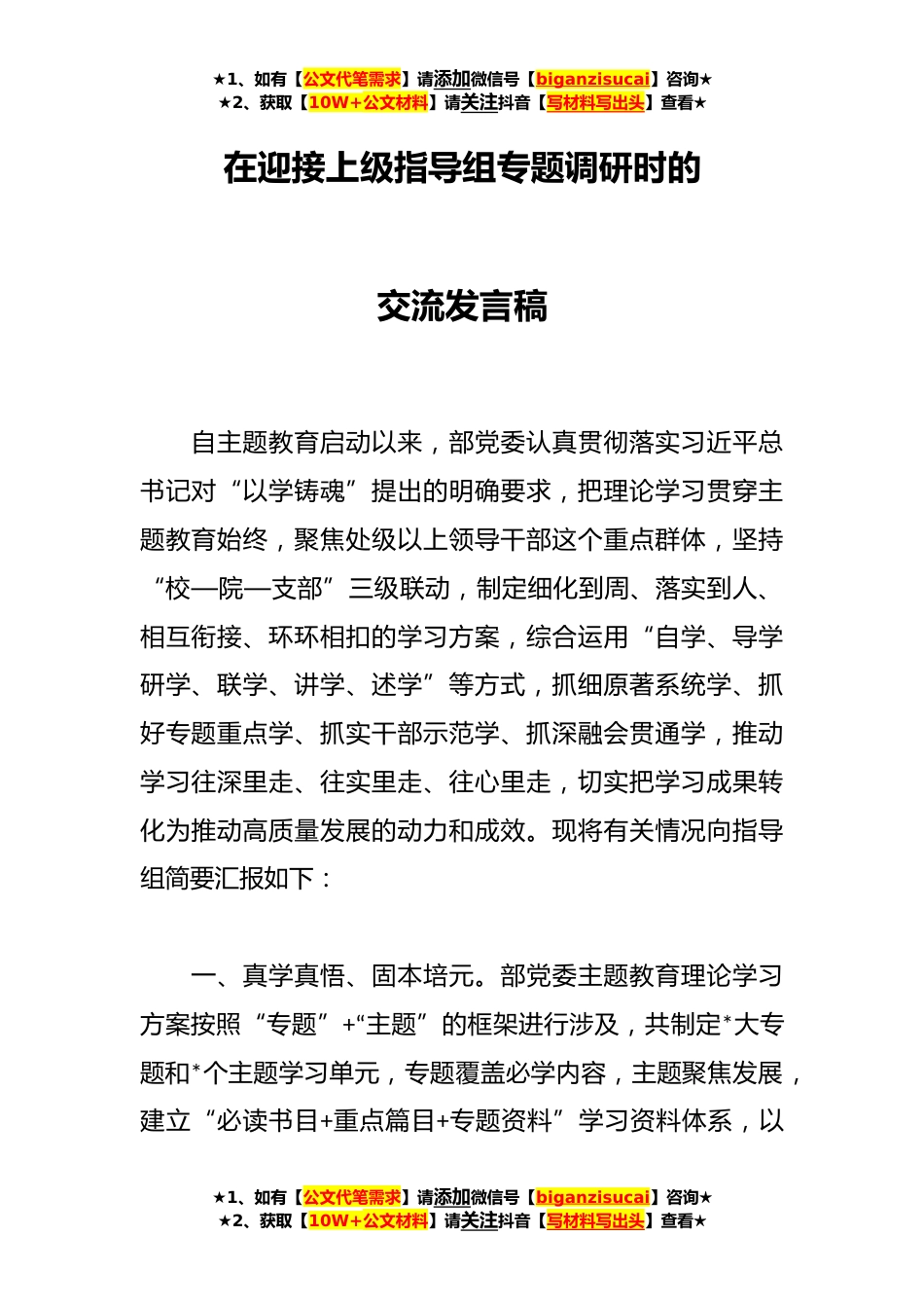 ★1、如有【公文代笔需求】请添加微信号【biganzisucai】咨询★★2、获取【10W+公文材料】请关注抖音【写材料写出头】查看★在迎接上级指导组专题调研时的交流发言稿自主题教育启动以来,部党委认真贯彻落实习近平总书记对“以学铸魂”提出的明确要求,把理论学习贯穿主题教育始终,聚焦处级以上领导干部这个重点群体,坚持“校—院—支部”三级联动,制定细化到周、落实到人、相互衔接、环环相扣的学习方案,综合运用“自学、导学研学、联学、讲学、述学”等方式,抓细原著系统学、抓好专题重点学、抓实干部示范学、抓深融会贯通学,推动学习往深里走、往实里走、往心里走,切实把学习成果转化为推动高质量发展的动力和成效。现将有关情况向指导组简要汇报如下:一、真学真悟、固本培元。部党委主题教育理论学习...