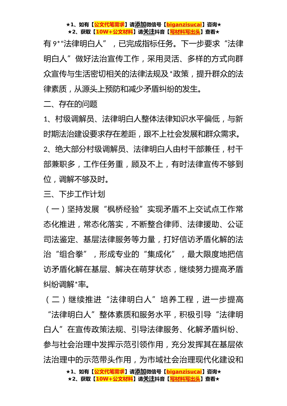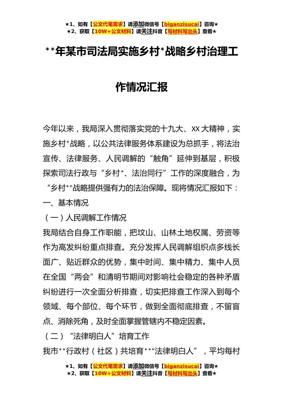 ★1、如有【公文代笔需求】请添加微信号【biganzisucai】咨询★★2、获取【10W+公文材料】请关注抖音【写材料写出头】查看★**年某市司法局实施乡村*战略乡村治理工作情况汇报今年以来,我局深入贯彻落实党的十九大、XX大精神,实施乡村*战略,以公共法律服务体系建设为总抓手,将法治宣传、法律服务、人民调解的“触角”延伸到基层,积极探索司法行政与“乡村*、法治同行”工作的深度融合,为“乡村*”战略提供强有力的法治保障。现将情况汇报如下:一、基本情况(一)人民调解工作情况我局结合自身工作职能,把坟山、山林土地权属、劳资等作为高发纠纷重点排查。充分发挥人民调解组织点多线长面广、贴近群众的优势,集中时间、集中精力、集中人员在全国“两会”和清明节期间对影响社会稳定的各种矛盾纠纷进行一...