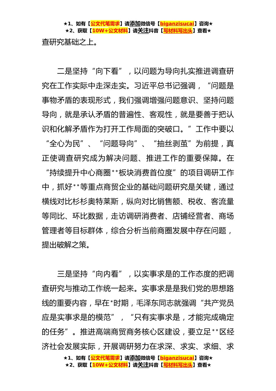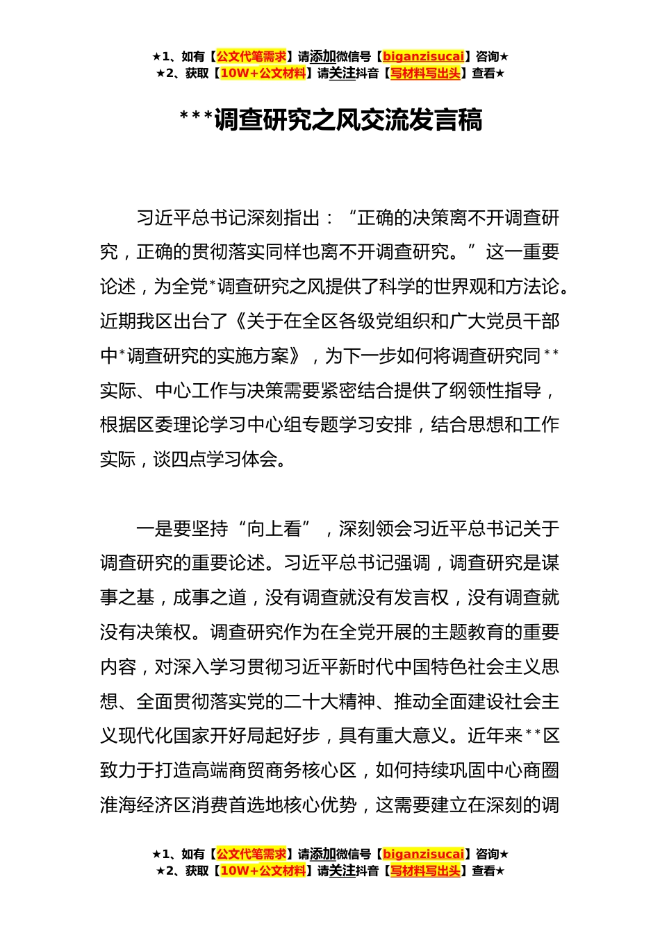 ★1、如有【公文代笔需求】请添加微信号【biganzisucai】咨询★★2、获取【10W+公文材料】请关注抖音【写材料写出头】查看★***调查研究之风交流发言稿习近平总书记深刻指出:“正确的决策离不开调查研究,正确的贯彻落实同样也离不开调查研究。”这一重要论述,为全党*调查研究之风提供了科学的世界观和方法论。近期我区出台了《关于在全区各级党组织和广大党员干部中*调查研究的实施方案》,为下一步如何将调查研究同**实际、中心工作与决策需要紧密结合提供了纲领性指导,根据区委理论学习中心组专题学习安排,结合思想和工作实际,谈四点学习体会。一是要坚持“向上看”,深刻领会习近平总书记关于调查研究的重要论述。习近平总书记强调,调查研究是谋事之基,成事之道,没有调查就没有发言权,没有调查就没有...