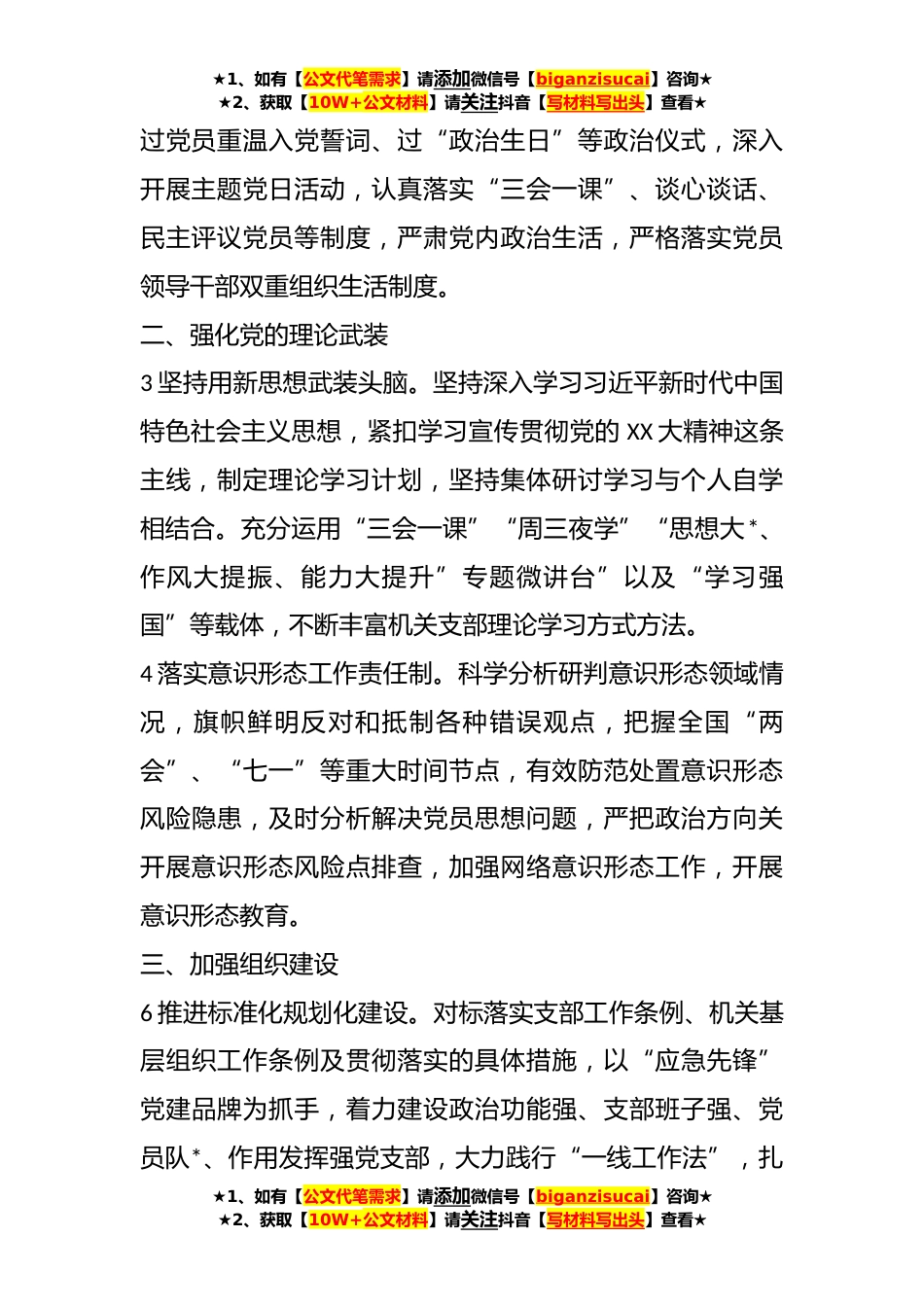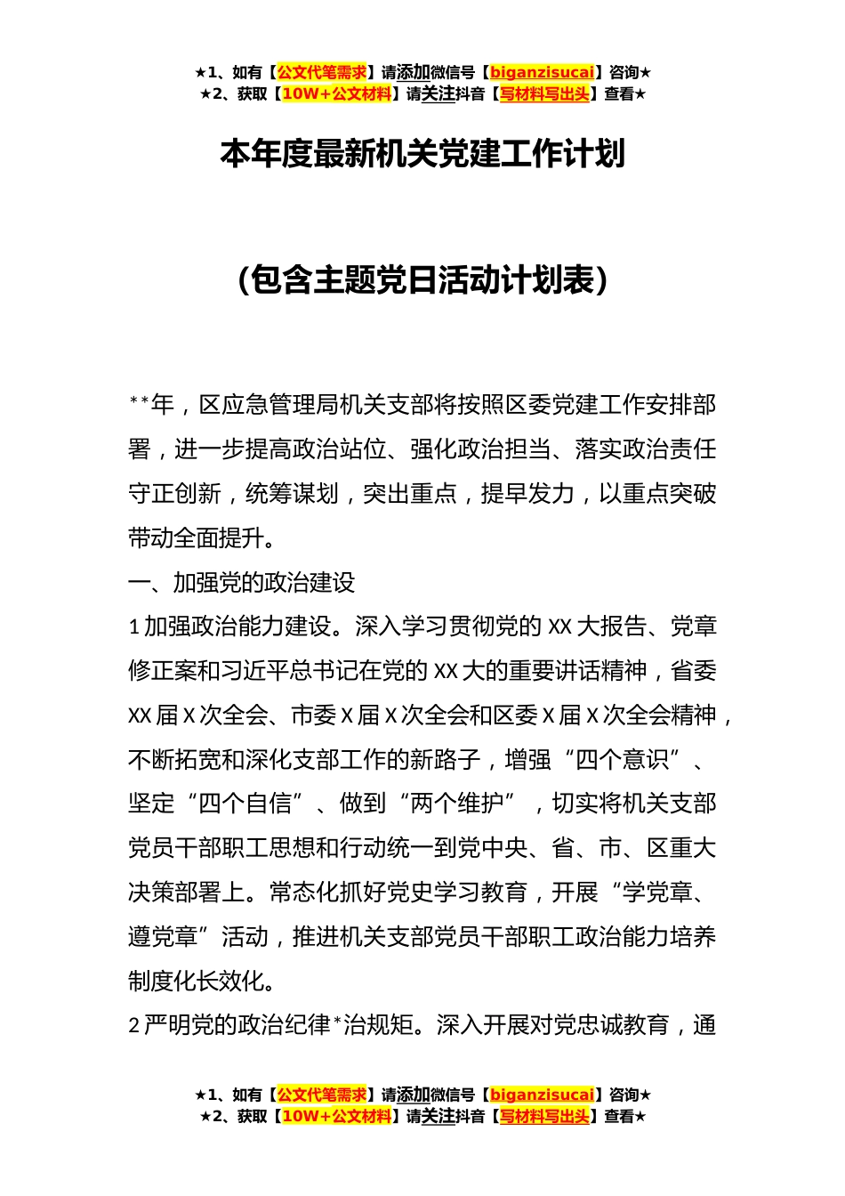 ★1、如有【公文代笔需求】请添加微信号【biganzisucai】咨询★★2、获取【10W+公文材料】请关注抖音【写材料写出头】查看★本年度最新机关党建工作计划(包含主题党日活动计划表)**年,区应急管理局机关支部将按照区委党建工作安排部署,进一步提高政治站位、强化政治担当、落实政治责任守正创新,统筹谋划,突出重点,提早发力,以重点突破带动全面提升。一、加强党的政治建设1加强政治能力建设。深入学习贯彻党的XX大报告、党章修正案和习近平总书记在党的XX大的重要讲话精神,省委XX届X次全会、市委X届X次全会和区委X届X次全会精神,不断拓宽和深化支部工作的新路子,增强“四个意识”、坚定“四个自信”、做到“两个维护”,切实将机关支部党员干部职工思想和行动统一到党中央、省、市、区重大决策部署上。...