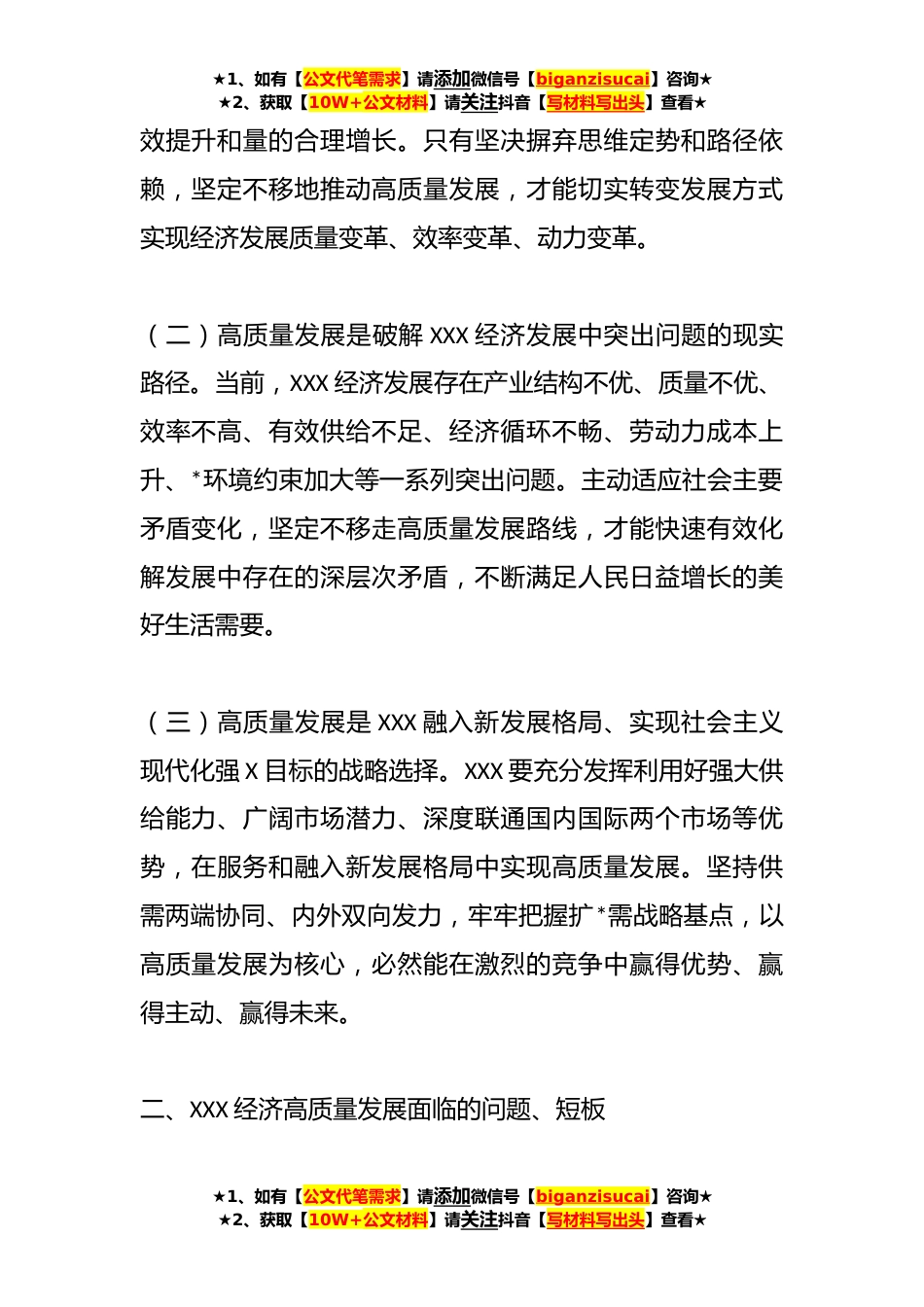 ★1、如有【公文代笔需求】请添加微信号【biganzisucai】咨询★★2、获取【10W+公文材料】请关注抖音【写材料写出头】查看★关于推动地区经济高质量发展工作报告在党的XX大报告中,习近平总书记强调“高质量发展是全面建设社会主义现代化国家的首要任务”。在参加十四届全国人大一次会议*代表团审议时,习近平总书记明确提出“四个必须”重要要求,系统阐述推动高质量发展的认识论和方法论,为全面建设社会主义现代化国家开好局起好步把脉定向,掌舵领航。当前,XXX正在全面贯彻习近平新时代中国特色社会主义思想和党的XX大精神,深刻把握高质量发展的深刻内涵和实践要求,切实把推动高质量发展的要求贯彻到XX经济社会发展的全过程各领域。一、推进XXX经济高质量发展的现实意义(一)高质量发展是XXX推动经济转型...