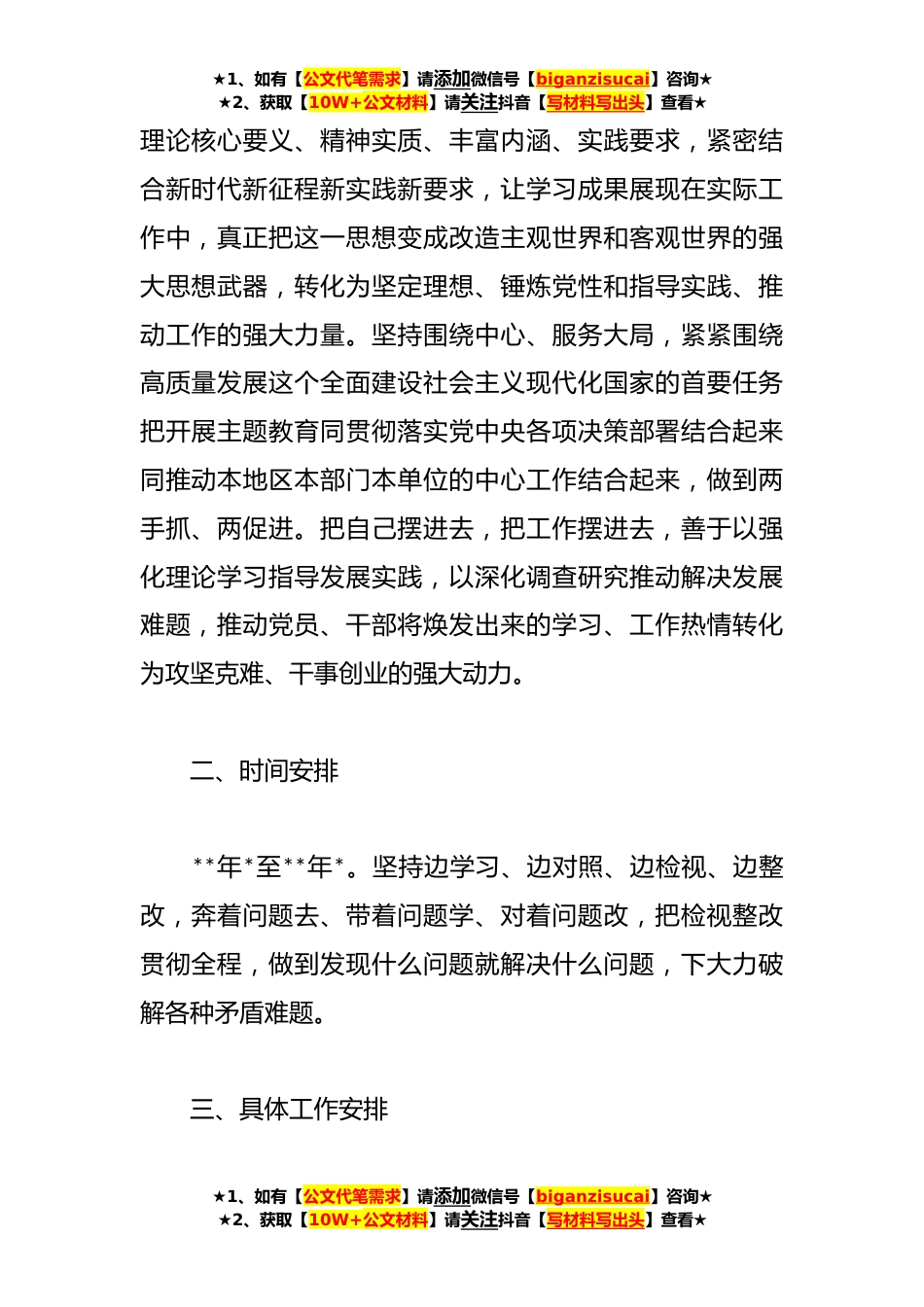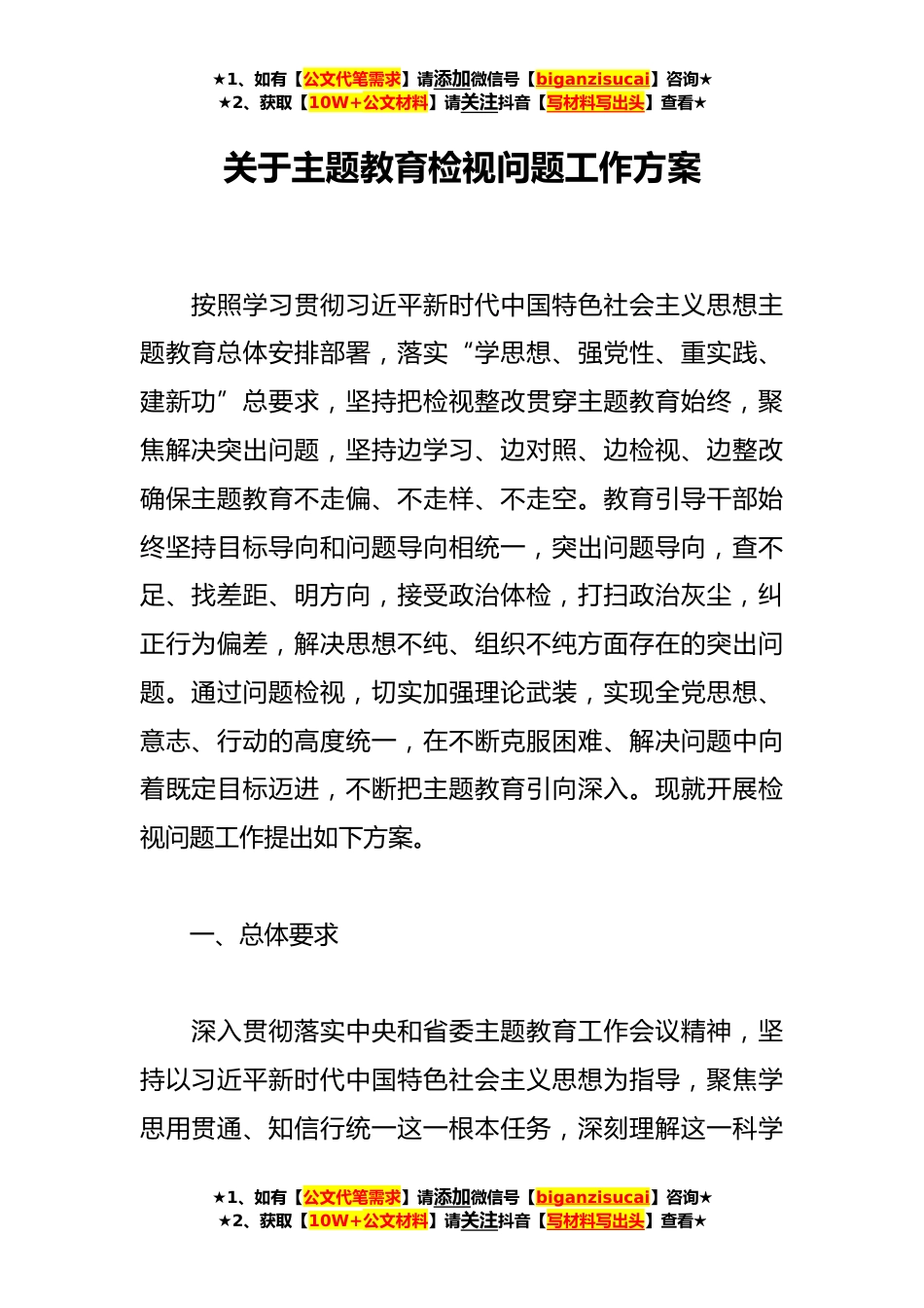 ★1、如有【公文代笔需求】请添加微信号【biganzisucai】咨询★★2、获取【10W+公文材料】请关注抖音【写材料写出头】查看★关于主题教育检视问题工作方案按照学习贯彻习近平新时代中国特色社会主义思想主题教育总体安排部署,落实“学思想、强党性、重实践、建新功”总要求,坚持把检视整改贯穿主题教育始终,聚焦解决突出问题,坚持边学习、边对照、边检视、边整改确保主题教育不走偏、不走样、不走空。教育引导干部始终坚持目标导向和问题导向相统一,突出问题导向,查不足、找差距、明方向,接受政治体检,打扫政治灰尘,纠正行为偏差,解决思想不纯、组织不纯方面存在的突出问题。通过问题检视,切实加强理论武装,实现全党思想、意志、行动的高度统一,在不断克服困难、解决问题中向着既定目标迈进,不断把...