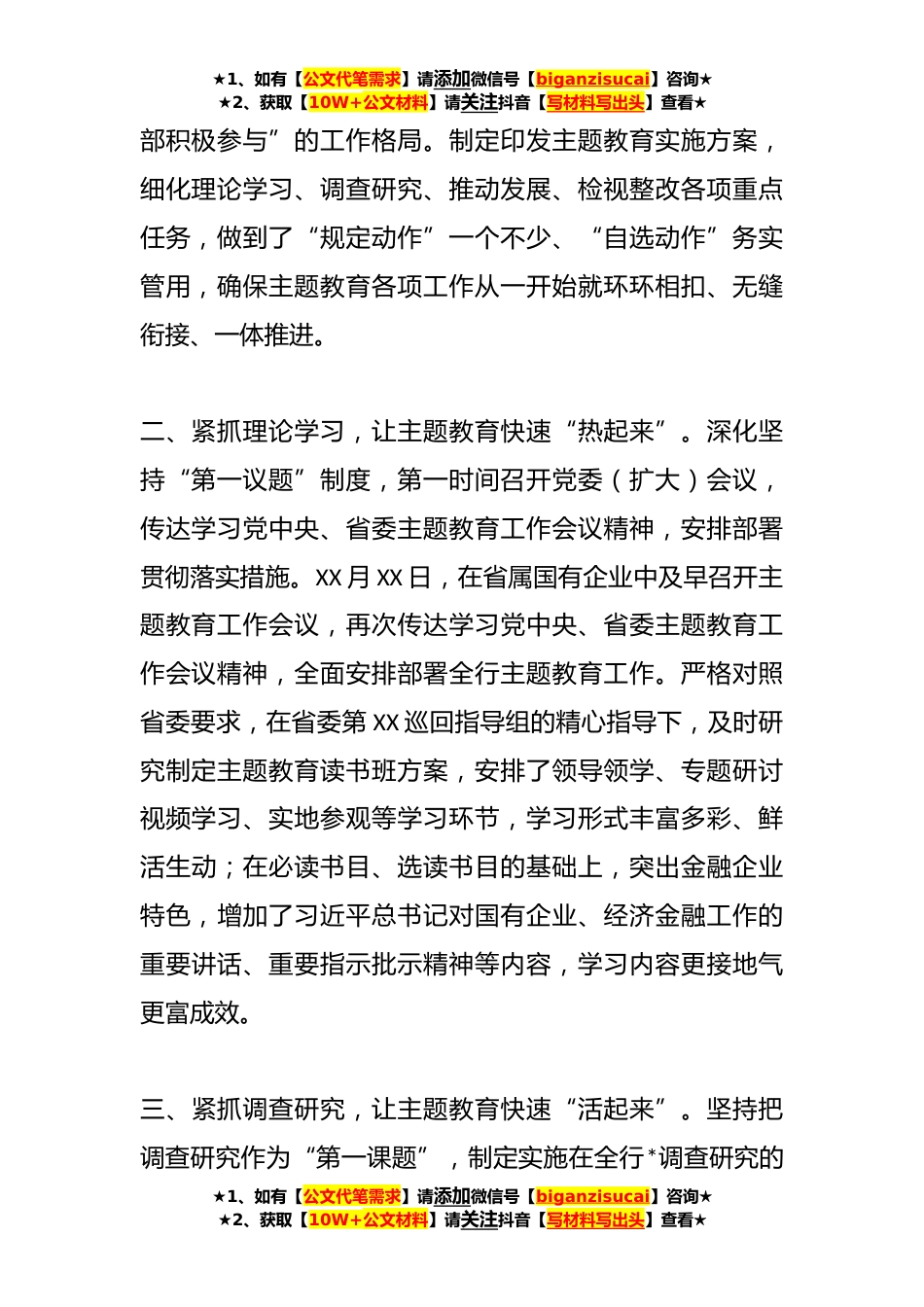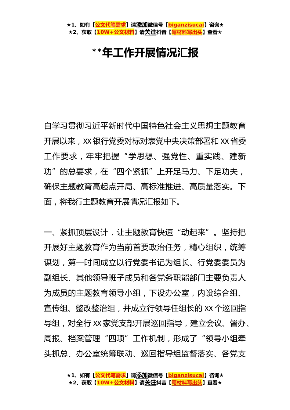 ★1、如有【公文代笔需求】请添加微信号【biganzisucai】咨询★★2、获取【10W+公文材料】请关注抖音【写材料写出头】查看★**年工作开展情况汇报自学习贯彻习近平新时代中国特色社会主义思想主题教育开展以来,XX银行党委对标对表党中央决策部署和XX省委工作要求,牢牢把握“学思想、强党性、重实践、建新功”的总要求,在“四个紧抓”上开足马力、下足功夫,确保主题教育高起点开局、高标准推进、高质量落实。下面,将我行主题教育开展情况汇报如下。一、紧抓顶层设计,让主题教育快速“动起来”。坚持把开展好主题教育作为当前首要政治任务,精心组织,统筹谋划,第一时间成立以行党委书记为组长、行党委委员为副组长、其他领导班子成员和各党务职能部门主要负责人为成员的主题教育领导小组,下设办公室,内设...