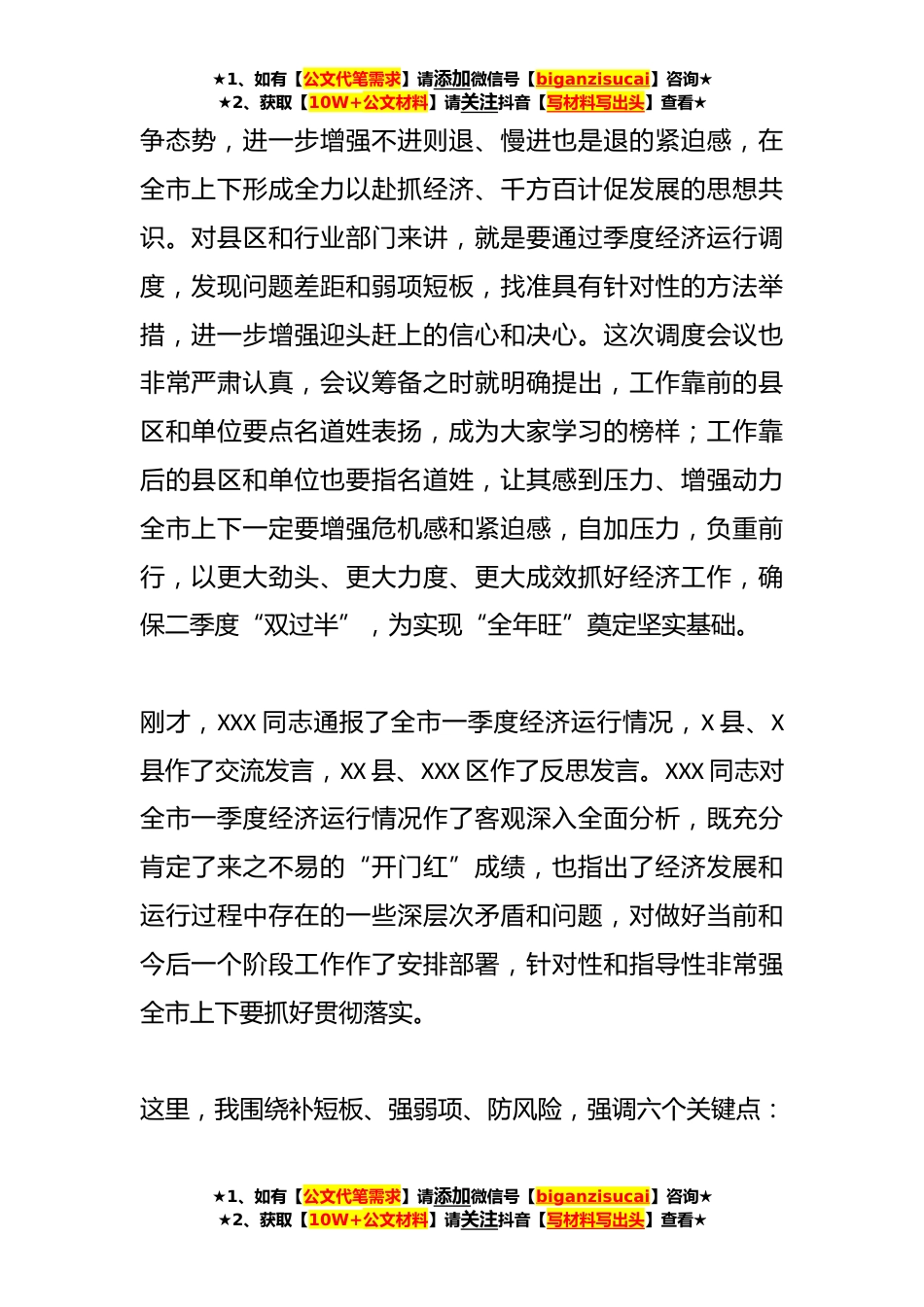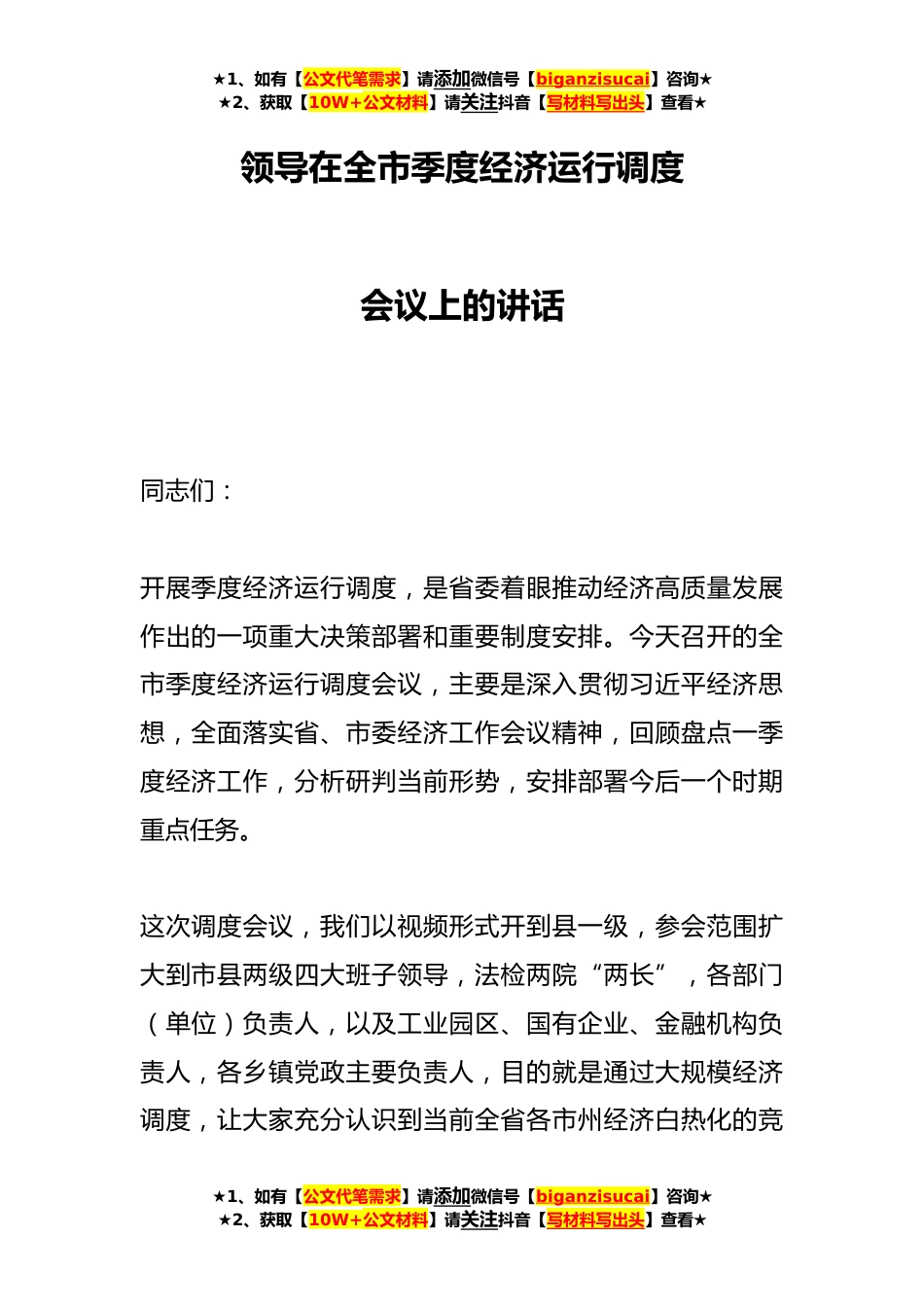 ★1、如有【公文代笔需求】请添加微信号【biganzisucai】咨询★★2、获取【10W+公文材料】请关注抖音【写材料写出头】查看★领导在全市季度经济运行调度会议上的讲话同志们:开展季度经济运行调度,是省委着眼推动经济高质量发展作出的一项重大决策部署和重要制度安排。今天召开的全市季度经济运行调度会议,主要是深入贯彻习近平经济思想,全面落实省、市委经济工作会议精神,回顾盘点一季度经济工作,分析研判当前形势,安排部署今后一个时期重点任务。这次调度会议,我们以视频形式开到县一级,参会范围扩大到市县两级四大班子领导,法检两院“两长”,各部门(单位)负责人,以及工业园区、国有企业、金融机构负责人,各乡镇党政主要负责人,目的就是通过大规模经济调度,让大家充分认识到当前全省各市州经济...
