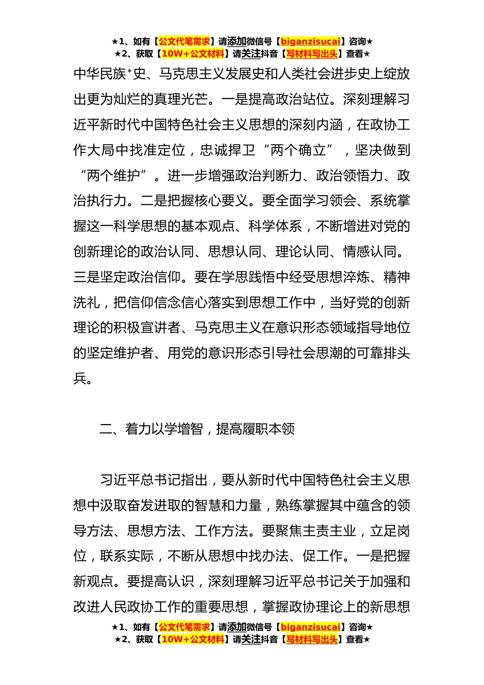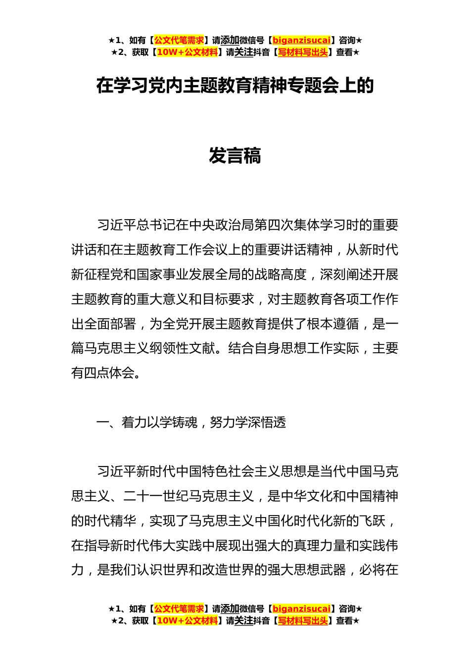 ★1、如有【公文代笔需求】请添加微信号【biganzisucai】咨询★★2、获取【10W+公文材料】请关注抖音【写材料写出头】查看★在学习党内主题教育精神专题会上的发言稿习近平总书记在中央政治局第四次集体学习时的重要讲话和在主题教育工作会议上的重要讲话精神,从新时代新征程党和国家事业发展全局的战略高度,深刻阐述开展主题教育的重大意义和目标要求,对主题教育各项工作作出全面部署,为全党开展主题教育提供了根本遵循,是一篇马克思主义纲领性文献。结合自身思想工作实际,主要有四点体会。一、着力以学铸魂,努力学深悟透习近平新时代中国特色社会主义思想是当代中国马克思主义、二十一世纪马克思主义,是中华文化和中国精神的时代精华,实现了马克思主义中国化时代化新的飞跃,在指导新时代伟大实践中展...