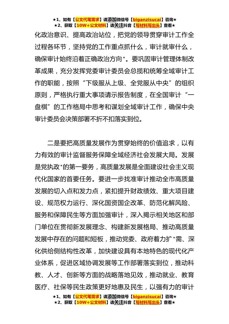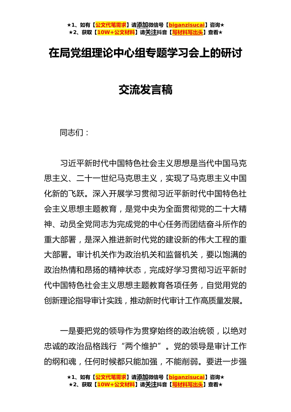 ★1、如有【公文代笔需求】请添加微信号【biganzisucai】咨询★★2、获取【10W+公文材料】请关注抖音【写材料写出头】查看★在局党组理论中心组专题学习会上的研讨交流发言稿同志们:习近平新时代中国特色社会主义思想是当代中国马克思主义、二十一世纪马克思主义,实现了马克思主义中国化新的飞跃。深入开展学习贯彻习近平新时代中国特色社会主义思想主题教育,是党中央为全面贯彻党的二十大精神、动员全党同志为完成党的中心任务而团结奋斗所作的重大部署,是深入推进新时代党的建设新的伟大工程的重大部署。审计机关作为政治机关和监督机关,要以饱满的政治热情和昂扬的精神状态,完成好学习贯彻习近平新时代中国特色社会主义思想主题教育各项任务,自觉用党的创新理论指导审计实践,推动新时代审计工作高质量...