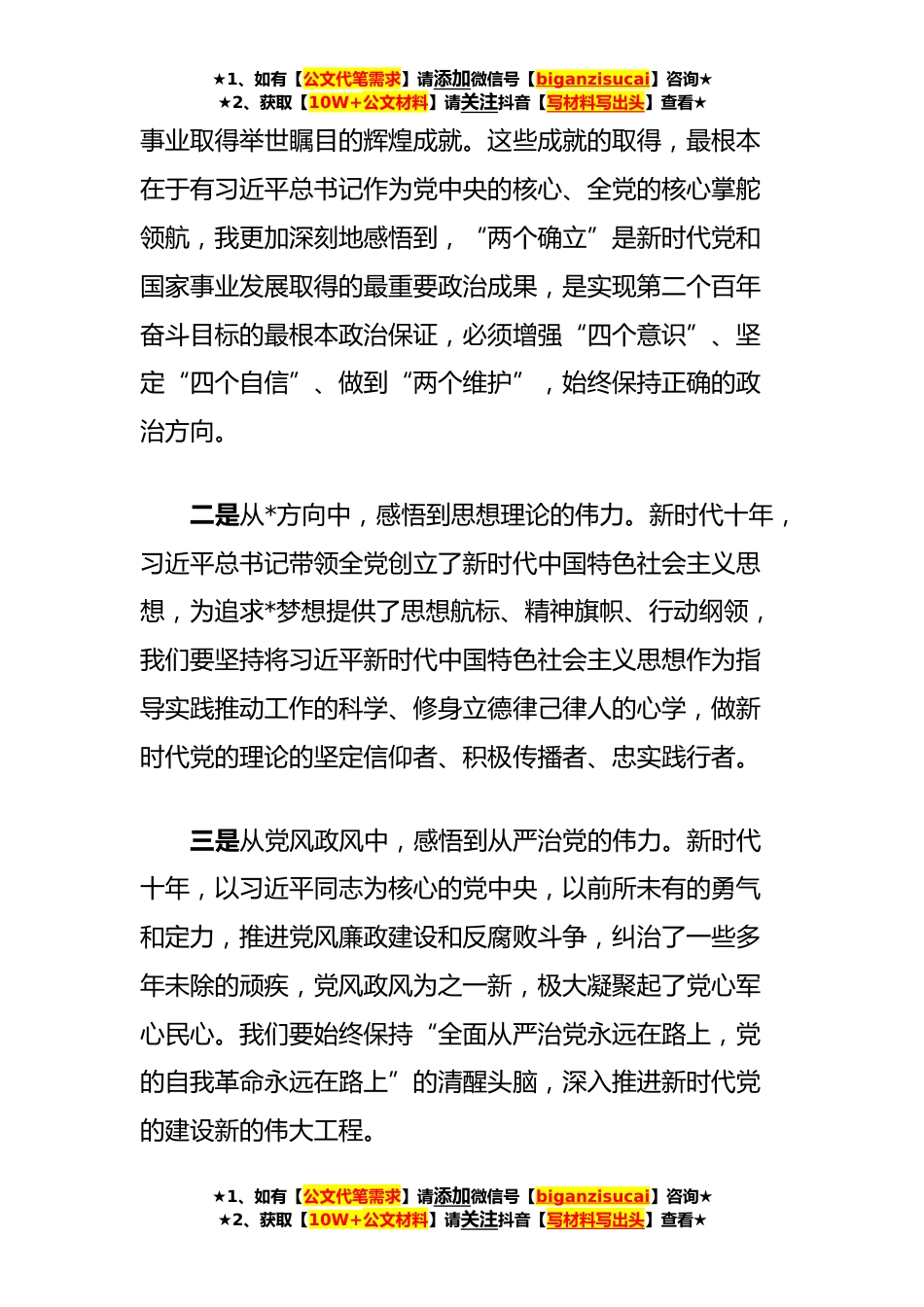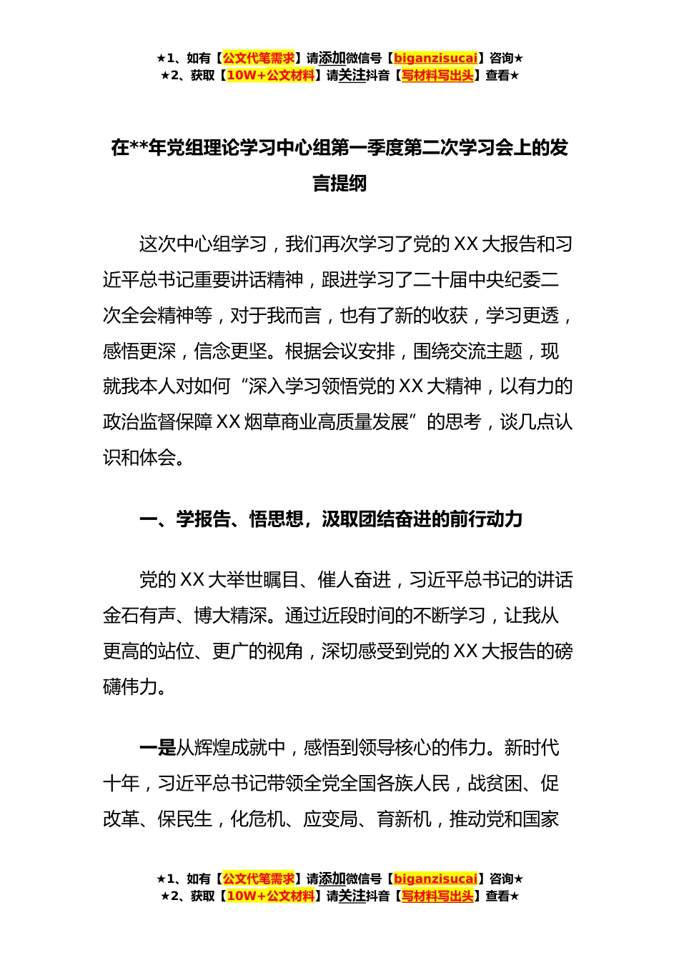 ★1、如有【公文代笔需求】请添加微信号【biganzisucai】咨询★★2、获取【10W+公文材料】请关注抖音【写材料写出头】查看★在**年党组理论学习中心组第一季度第二次学习会上的发言提纲这次中心组学习,我们再次学习了党的XX大报告和习近平总书记重要讲话精神,跟进学习了二十届中央纪委二次全会精神等,对于我而言,也有了新的收获,学习更透,感悟更深,信念更坚。根据会议安排,围绕交流主题,现就我本人对如何“深入学习领悟党的XX大精神,以有力的政治监督保障XX烟草商业高质量发展”的思考,谈几点认识和体会。一、学报告、悟思想,汲取团结奋进的前行动力党的XX大举世瞩目、催人奋进,习近平总书记的讲话金石有声、博大精深。通过近段时间的不断学习,让我从更高的站位、更广的视角,深切感受到党的XX大报...
