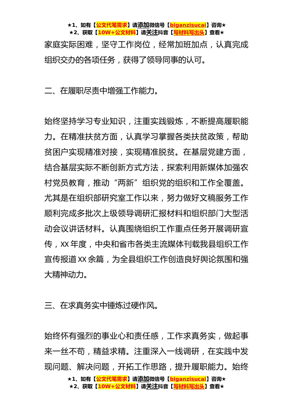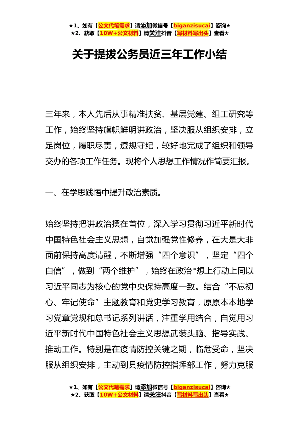 ★1、如有【公文代笔需求】请添加微信号【biganzisucai】咨询★★2、获取【10W+公文材料】请关注抖音【写材料写出头】查看★关于提拔公务员近三年工作小结三年来,本人先后从事精准扶贫、基层党建、组工研究等工作,始终坚持旗帜鲜明讲政治,坚决服从组织安排,立足岗位,履职尽责,遵规守纪,较好地完成了组织和领导交办的各项工作任务。现将个人思想工作情况作简要汇报。一、在学思践悟中提升政治素质。始终坚持把讲政治摆在首位,深入学习贯彻习近平新时代中国特色社会主义思想,自觉加强党性修养,在大是大非面前保持高度清醒,不断增强“四个意识”,坚定“四个自信”,做到“两个维护”,始终在政治*想上行动上同以习近平同志为核心的党中央保持高度一致。结合“不忘初心、牢记使命”主题教育和党史学习教育...