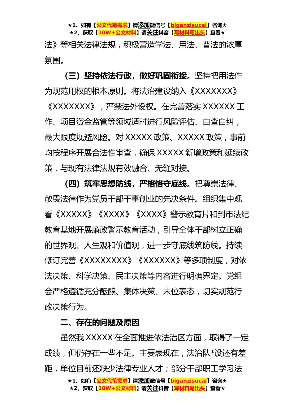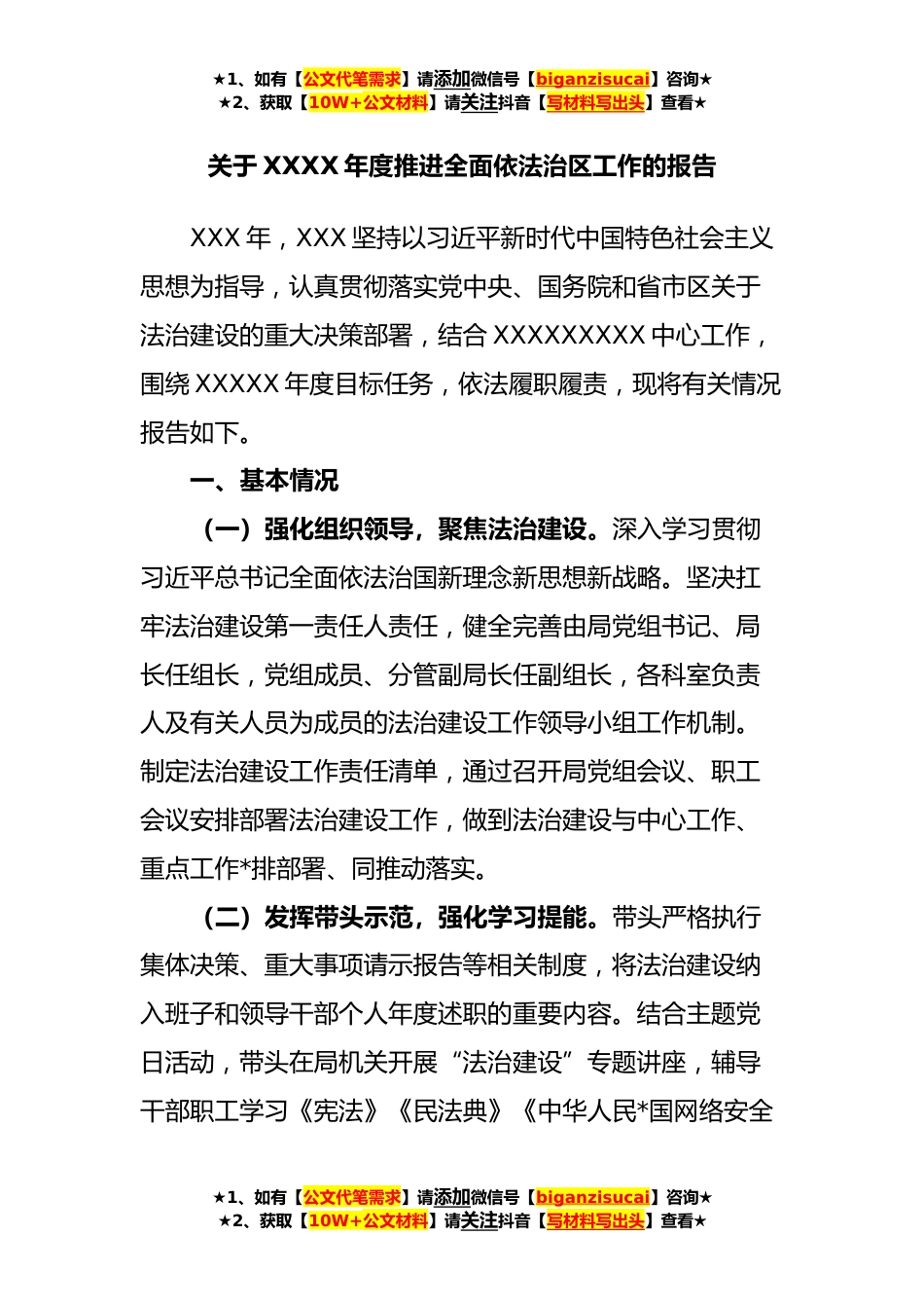 ★1、如有【公文代笔需求】请添加微信号【biganzisucai】咨询★★2、获取【10W+公文材料】请关注抖音【写材料写出头】查看★关于XXXX年度推进全面依法治区工作的报告XXX年,XXX坚持以习近平新时代中国特色社会主义思想为指导,认真贯彻落实党中央、国务院和省市区关于法治建设的重大决策部署,结合XXXXXXXXX中心工作,围绕XXXXX年度目标任务,依法履职履责,现将有关情况报告如下。一、基本情况(一)强化组织领导,聚焦法治建设。深入学习贯彻习近平总书记全面依法治国新理念新思想新战略。坚决扛牢法治建设第一责任人责任,健全完善由局党组书记、局长任组长,党组成员、分管副局长任副组长,各科室负责人及有关人员为成员的法治建设工作领导小组工作机制。制定法治建设工作责任清单,通过召开局党组会议、职工...