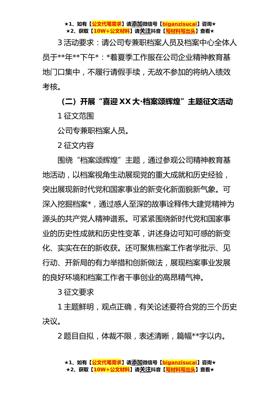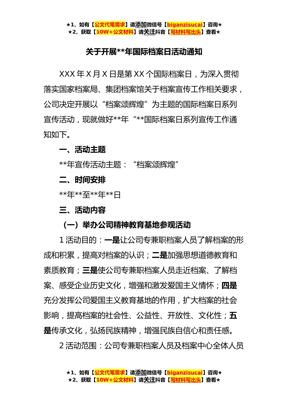 ★1、如有【公文代笔需求】请添加微信号【biganzisucai】咨询★★2、获取【10W+公文材料】请关注抖音【写材料写出头】查看★关于开展**年国际档案日活动通知XXX年X月X日是第XX个国际档案日,为深入贯彻落实国家档案局、集团档案馆关于档案宣传工作相关要求,公司决定开展以“档案颂辉煌”为主题的国际档案日系列宣传活动,现就做好**年“**国际档案日系列宣传工作通知如下。一、活动主题**年宣传活动主题:“档案颂辉煌”二、时间安排**年**至**年**日三、活动内容(一)举办公司精神教育基地参观活动1活动目的:一是让公司专兼职档案人员了解档案的形成和积累,提高对档案的认识;二是加强思想道德教育和素质教育;三是使公司专兼职档案人员走近档案、了解档案、感受企业历史文化,增强和激发爱国主义情怀;四是...