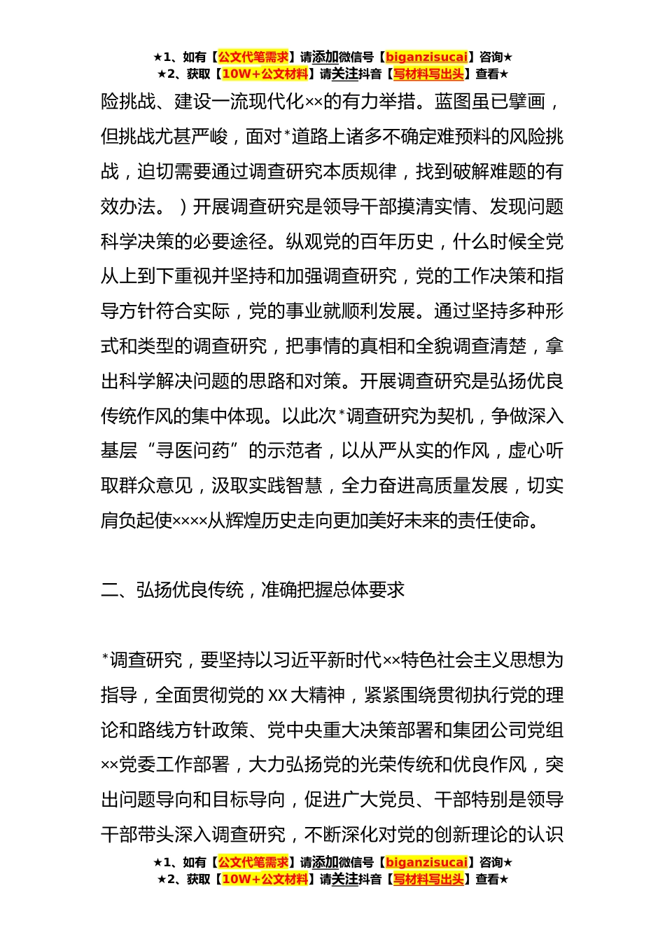 ★1、如有【公文代笔需求】请添加微信号【biganzisucai】咨询★★2、获取【10W+公文材料】请关注抖音【写材料写出头】查看★关于*调查研究的实施方案根据中共中央办公厅《关于在全党*调查研究的工作方案》及集团公司党组办公室《贯彻落实《关于在全党*调查研究的工作方案》的实施细则》部署要求,结合××公司实际,制定本实施方案。一、提高政治站位,深刻认识重要意义坚持以习近平新时代××特色社会主义思想为指导,充分认识和准确把握党中央在全党*调查研究的重要意义,认真执行落实本实施方案,扎实开展调查研究,把调查研究作为破解难点问题和促进××发展的有效途径,不断提高新形势下调查研究工作的质量和水平。开展调查研究是深入学习贯彻落实习近平总书记重要指示精神的切实行动。深入学习贯彻落实习近...