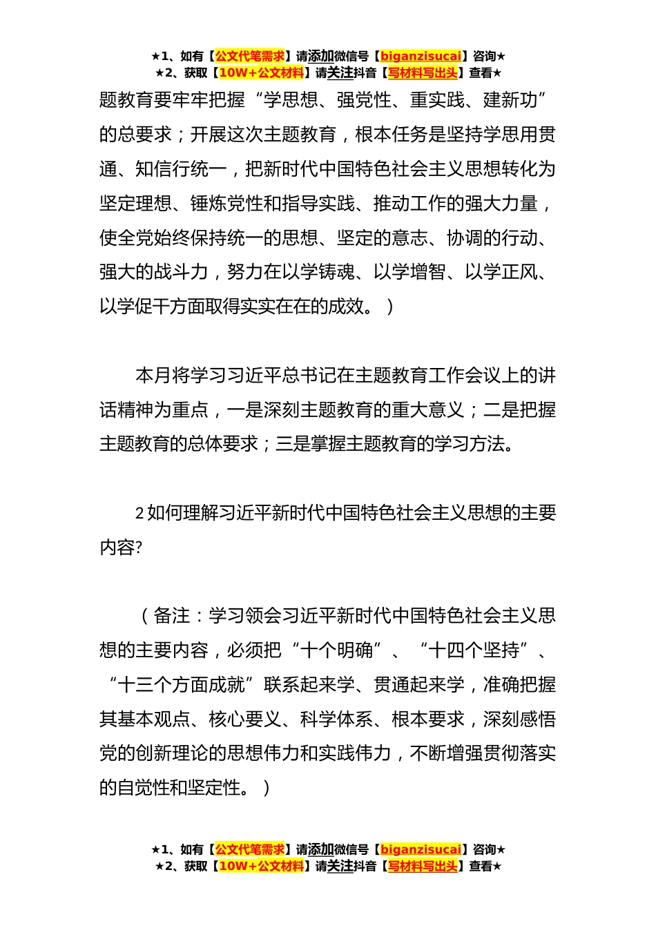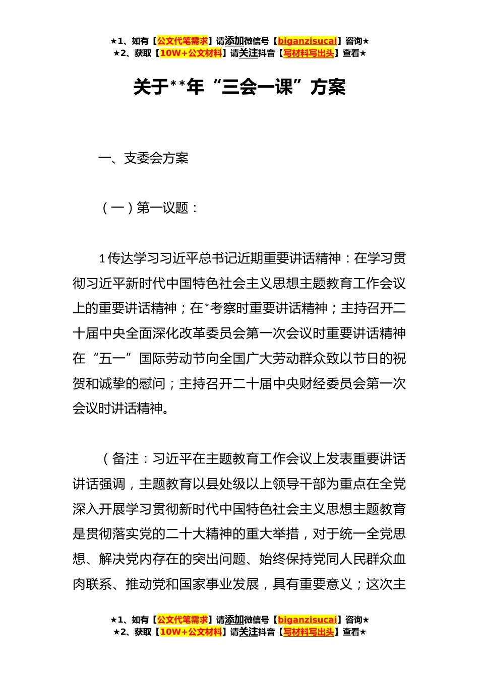 ★1、如有【公文代笔需求】请添加微信号【biganzisucai】咨询★★2、获取【10W+公文材料】请关注抖音【写材料写出头】查看★关于**年“三会一课”方案一、支委会方案(一)第一议题:1传达学习习近平总书记近期重要讲话精神:在学习贯彻习近平新时代中国特色社会主义思想主题教育工作会议上的重要讲话精神;在*考察时重要讲话精神;主持召开二十届中央全面深化改革委员会第一次会议时重要讲话精神在“五一”国际劳动节向全国广大劳动群众致以节日的祝贺和诚挚的慰问;主持召开二十届中央财经委员会第一次会议时讲话精神。(备注:习近平在主题教育工作会议上发表重要讲话讲话强调,主题教育以县处级以上领导干部为重点在全党深入开展学习贯彻新时代中国特色社会主义思想主题教育是贯彻落实党的二十大精神的重大举...