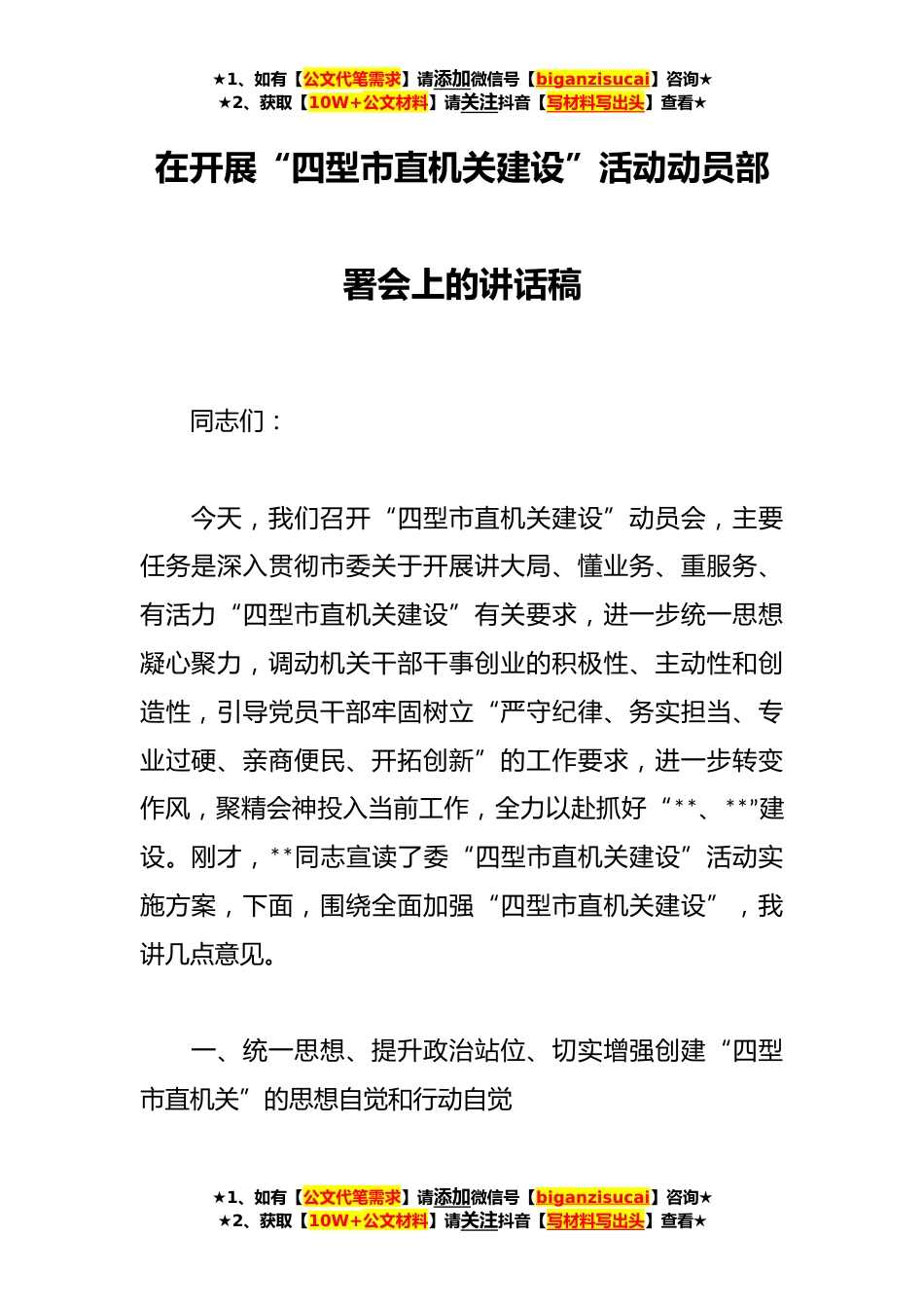 ★1、如有【公文代笔需求】请添加微信号【biganzisucai】咨询★★2、获取【10W+公文材料】请关注抖音【写材料写出头】查看★在开展“四型市直机关建设”活动动员部署会上的讲话稿同志们:今天,我们召开“四型市直机关建设”动员会,主要任务是深入贯彻市委关于开展讲大局、懂业务、重服务、有活力“四型市直机关建设”有关要求,进一步统一思想凝心聚力,调动机关干部干事创业的积极性、主动性和创造性,引导党员干部牢固树立“严守纪律、务实担当、专业过硬、亲商便民、开拓创新”的工作要求,进一步转变作风,聚精会神投入当前工作,全力以赴抓好“**、**”建设。刚才,**同志宣读了委“四型市直机关建设”活动实施方案,下面,围绕全面加强“四型市直机关建设”,我讲几点意见。一、统一思想、提升政治站位、...