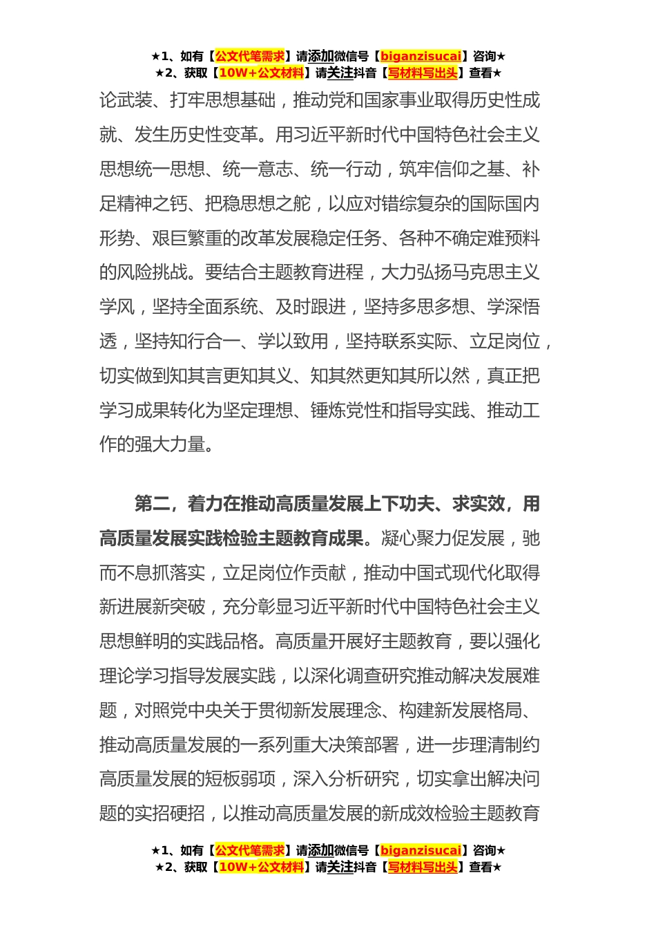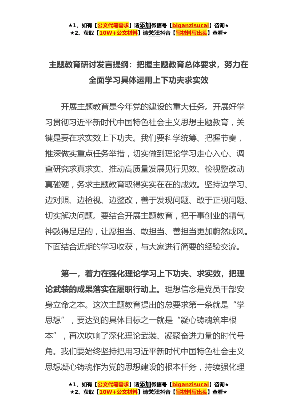 ★1、如有【公文代笔需求】请添加微信号【biganzisucai】咨询★★2、获取【10W+公文材料】请关注抖音【写材料写出头】查看★主题教育研讨发言提纲:把握主题教育总体要求,努力在全面学习具体运用上下功夫求实效开展主题教育是今年党的建设的重大任务。开展好学习贯彻习近平新时代中国特色社会主义思想主题教育,关键是要在求实效上下功夫。我们要科学统筹、把握节奏,推深做实重点任务举措,切实做到理论学习走心入心、调查研究求真求实、推动高质量发展见行见效、检视整改动真碰硬,务求主题教育取得实实在在的成效。坚持边学习、边对照、边检视、边整改,善于发现问题、敢于正视问题、切实解决问题。要结合开展主题教育,把干事创业的精气神鼓得足足的,让愿担当、敢担当、善担当更加蔚然成风。下面结合近期的...