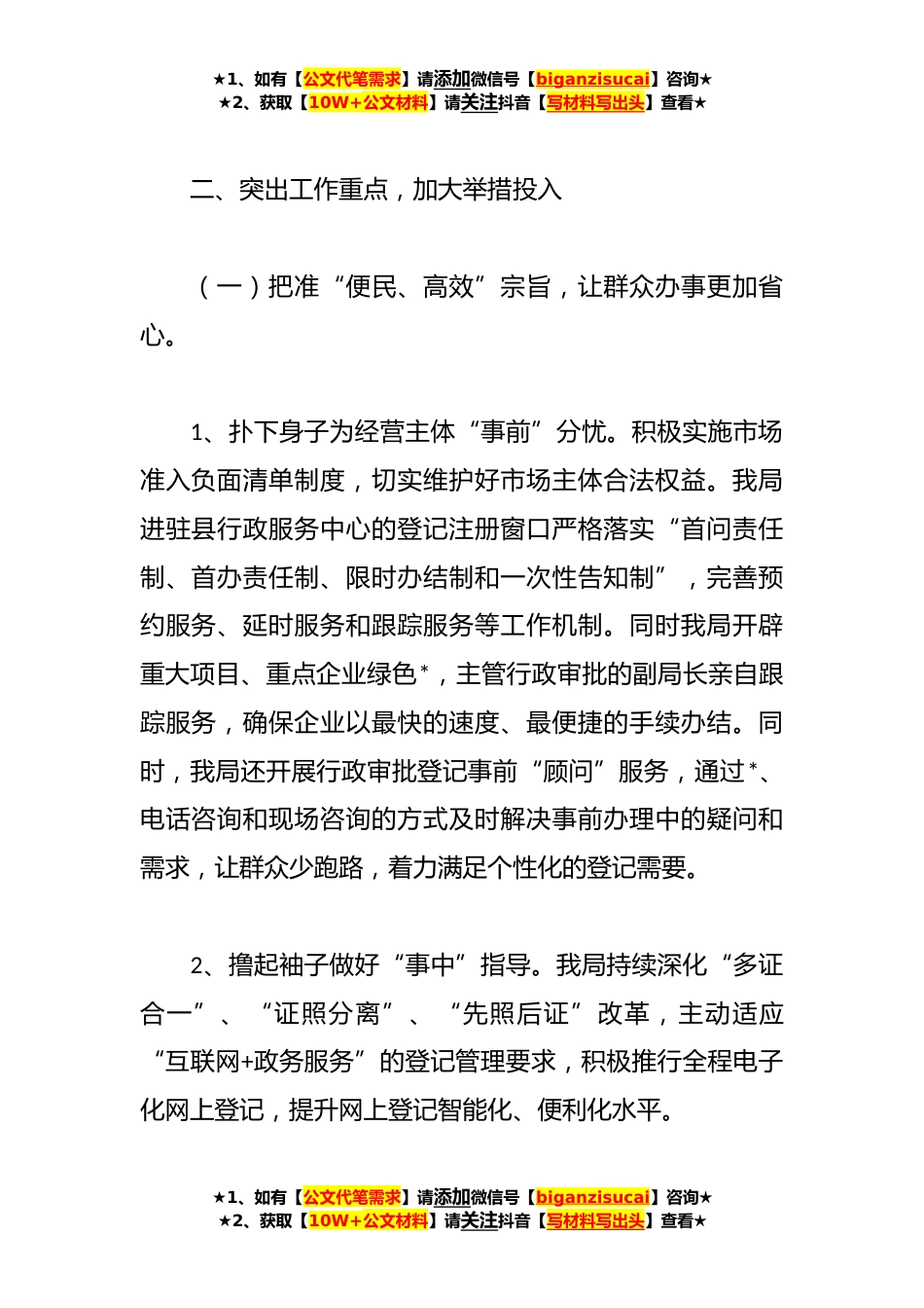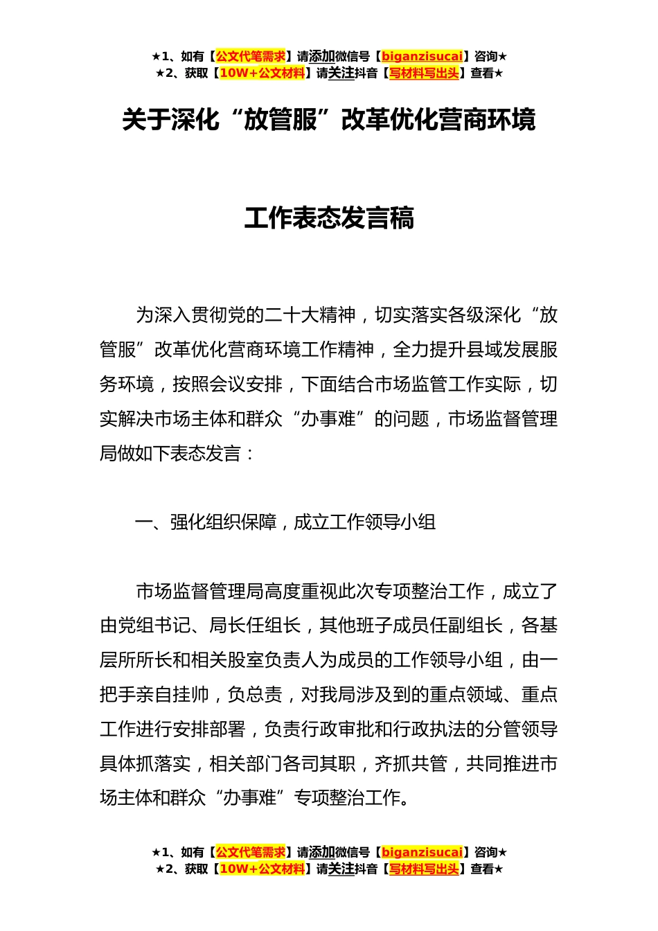★1、如有【公文代笔需求】请添加微信号【biganzisucai】咨询★★2、获取【10W+公文材料】请关注抖音【写材料写出头】查看★关于深化“放管服”改革优化营商环境工作表态发言稿为深入贯彻党的二十大精神,切实落实各级深化“放管服”改革优化营商环境工作精神,全力提升县域发展服务环境,按照会议安排,下面结合市场监管工作实际,切实解决市场主体和群众“办事难”的问题,市场监督管理局做如下表态发言:一、强化组织保障,成立工作领导小组市场监督管理局高度重视此次专项整治工作,成立了由党组书记、局长任组长,其他班子成员任副组长,各基层所所长和相关股室负责人为成员的工作领导小组,由一把手亲自挂帅,负总责,对我局涉及到的重点领域、重点工作进行安排部署,负责行政审批和行政执法的分管领导具体...